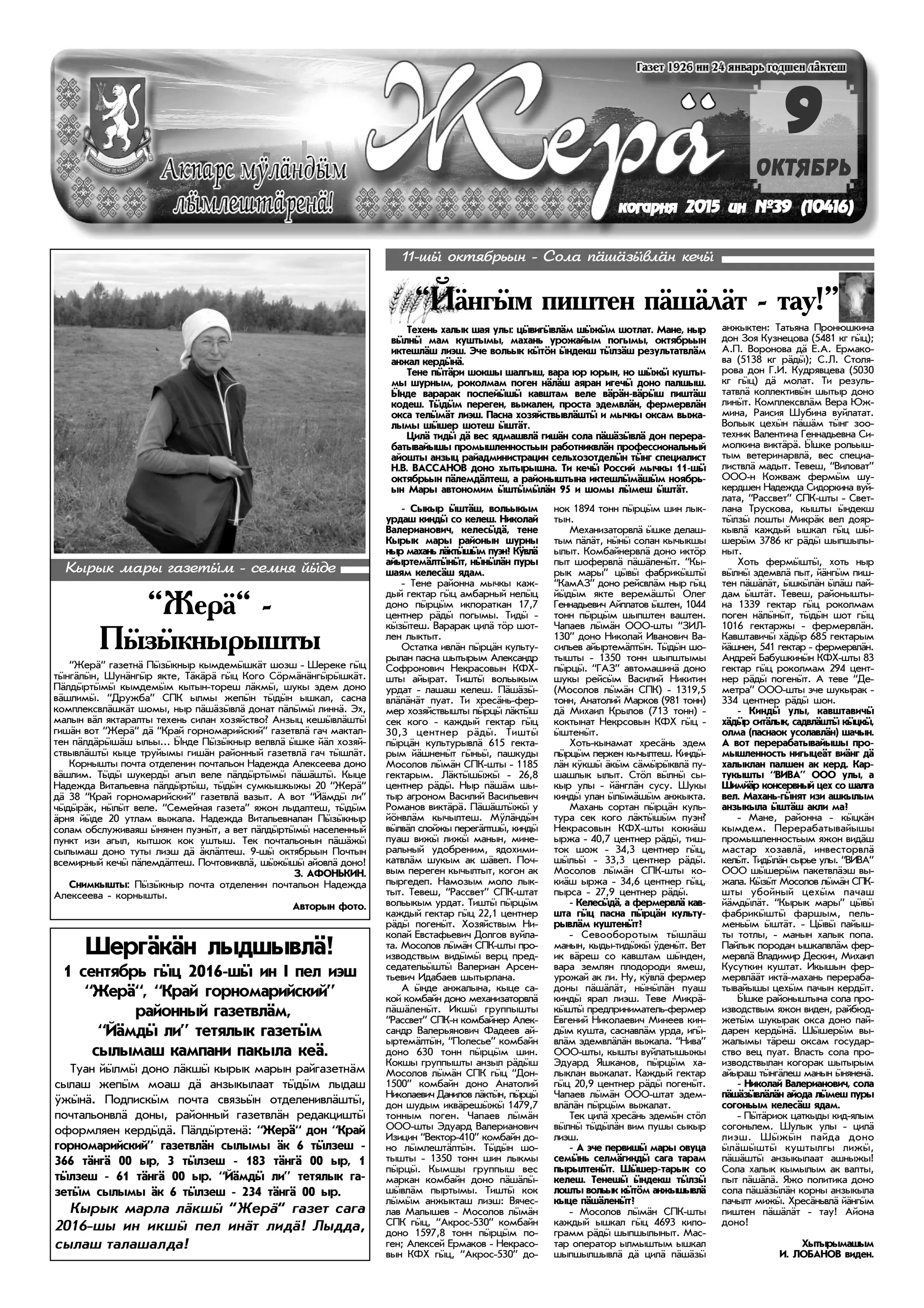 2015 èíêîãàðíÿ 2015 èíêîãàðíÿ 2015 èíêîãàðíÿ 2015 èí ¹¹¹¹¹3939393939 (((((10416)10416)10416)10416)10416) ÎÊÒßÁÐÜÎÊÒßÁÐÜÎÊÒßÁÐÜÎÊÒßÁÐÜÎÊÒßÁÐÜ “Æå𳓠- Ï¿ç¿êíûðûøòû “Æå𳓠ãàçåòí³ Ï¿ç¿êíûð êûìäåì¿øê³ò øîýø - Øåðåêå ã¿ö ò¿íã³ë¿í, Øóí³íã¿ð ÿêòå, Ò³ê³ð³ ã¿ö Êîãî Ѻðì³í³íã¿ð¿øê³ò. ϳëä¿ðò¿ì¿ êûìäåì¿ì êûòûí-òîðåø ë³êì¿, øóêû ýäåì äîíî â³øëèì¿. “Äðóæáà” ÑÏÊ ûëìû æåï¿í ò¿ä¿í ûøêàë, ñàñíà êîìïëåêñâë³øê³ò øîìû, íûð ï³ø³ç¿âë³ äîíàò ï³ë¿ì¿ ëèíí³. Ýõ, ìàëûí â³ë ÿêòàðàëòû òåõåíü ñèëàí õîçÿéñòâî? Àíçûö êåø¿âë³øò¿ ãèø³í âîò “Æåð³“ ä³ “Êðàé ãîðíîìàðèéñêèé” ãàçåòâë³ ãà÷ ìàêòàë- òåí ï³ëä³ð¿ø³ø ûëüû... ¯íäå Ï¿ç¿êíûð âåëâë³ ¿øêå é³ë õîçÿé- ñòâûâë³øò¿ êûöå òðóéûìû ãèø³í ðàéîííûé ãàçåòâë³ ãà÷ ò¿øë³ò. Êîðíûøòû ïî÷òà îòäåëåíèí ïî÷òàëüîí Íàäåæäà Àëåêñååâà äîíî â³øëèì. Ò¿ä¿ øóêåðä¿ àãûë âåëå ï³ëä¿ðò¿ì¿ ï³ø³øò¿. Êûöå Íàäåæäà Âèòàëüåâíà ï³ëä¿ðò¿ø, ò¿ä¿í ñóìêûøêûæû 20 “Æåð³“ ä³ 38 “Êðàé ãîðíîìàðèéñêèé” ãàçåòâë³ âàçûò. À âîò “ɳìä¿ ëè” ÷¿ä¿ð³ê, í¿ë¿ò âåëå. “Ñåìåéíàÿ ãàçåòà” ÿæîí ëûäàëòåø, ò¿ä¿ì ³ðíÿ é¿äå 20 óòëàì âûæàëà. Íàäåæäà Âèòàëüåâíàëàí Ï¿ç¿êíûð ñîëàì îáñëóæèâàÿø ¿íÿíåí ïóýí¿ò, à âåò ï³ëä¿ðò¿ì¿ íàñåëåííûé ïóíêò èçè àãûë, êûòøîê êîê óøòûø. Òåê ïî÷òàëüîíûí ï³ø³æ¿ ñûëûìàø äîíî òóòû ëèýø ä³ ³êë³ëòåø. 9-ø¿ îêòÿáðüûí Ïî÷òûí âñåìèðíûé êå÷¿ ï³ëåìä³ëòåø. Ïî÷òîâèêâë³, ø¿æ¿ø¿ àéîâë³ äîíî! Ç. ÀÔÎÍÜÊÈÍ. Ñíèìêûøòû: Ï¿ç¿êíûð ïî÷òà îòäåëåíèí ïî÷òàëüîí Íàäåæäà Àëåêñååâà - êîðíûøòû. Àâòîðûí ôîòî. Êûðûê ìàðû ãàçåò¿ì - ñåìíÿ é¿äå Òåõåíü õàëûê øàÿ óëû: ö¿âèã¿âë³ì ø¿æ¿ì øîòëàò. Ìàíå, íûð â¿ëí¿ ìàì êóøòûìû, ìàõàíü óðîæàéûì ïîãûìû, îêòÿáðüûí èêòåøë³ø ëèýø. Ý÷å âîëüûê ê¿òºí ¿íäåêø ò¿ëç³ø ðåçóëüòàòâë³ì àíæàë êåðä¿í³. Òåíå ï¿ò³ðè øîêøû øàëãûø, âàðà þð þðûí, íî ø¿æ¿ êóøòû- ìû øóðíûì, ðîêîëìàì ïîãåí í³ë³ø àÿðàí èãå÷¿ äîíî ïàëøûø. ¯íäå âàðàðàê ïîñïåé¿ø¿ êàâøòàì âåëå â³ð³í-â³ð¿ø ïèøò³ø êîäåø. Ò¿ä¿ì ïåðåãåí, âûæàëåí, ïðîñòà ýäåìâë³í, ôåðìåðâë³í îêñà òåë¿ì³ò ëèýø. Ïàñíà õîçÿéñòâûâë³øò¿ è ìû÷êû îêñàì âûæà- ëûìû ø¿øåð øîòåø ¿øò³ò. Öèë³ òèä¿ ä³ âåñ ÿäìàøâë³ ãèø³í ñîëà ï³ø³ç¿âë³ äîí ïåðåðà- áàòûâàéûøû ïðîìûøëåííîñòüûí ðàáîòíèêâë³í ïðîôåññèîíàëüíûé àéîøòû àíçûö ðàéàäìèíèñòðàöèí ñåëüõîçîòäåë¿í ò¿íã ñïåöèàëèñò Í.Â. ÂÀÑÑÀÍΠäîíî õûòûðûøíà. Òè êå÷¿ Ðîññèé ìû÷êû 11-ø¿ îêòÿáðüûí ï³ëåìä³ëòåø, à ðàéîíûøòûíà èêòåøë¿ì³ø¿ì íîÿáðü- ûí Ìàðû àâòîíîìèì ¿øò¿ì¿ë³í 95 è øîìû ë¿ìåø ¿øò³ò. 11-ø¿ îêòÿáðüûí - Ñîëà ï³ø³ç¿âë³í êå÷¿ Øåðã³ê³í ëûäøûâë³! 1 ñåíòÿáðü ã¿ö 2016-ø¿ èí I ïåë èýø “Æåð³“, “Êðàé ãîðíîìàðèéñêèé” ðàéîííûé ãàçåòâë³ì, “ɳìä¿ ëè” òåòÿëûê ãàçåò¿ì ñûëûìàø êàìïàíè ïàêûëà êå³. Òóàí é¿ëì¿ äîíî ë³êø¿ êûðûê ìàðûí ðàéãàçåòí³ì ñûëàø æåï¿ì ìîàø ä³ àíçûêûëààò ò¿ä¿ì ëûäàø ¢æ¿í³. Ïîäïèñê¿ì ïî÷òà ñâÿçü¿í îòäåëåíèâë³øò¿, ïî÷òàëüîíâë³ äîíû, ðàéîííûé ãàçåòâë³í ðåäàêöèøò¿ îôîðìëÿåí êåðä¿ä³. ϳëä¿ðòåí³: “Æå𳓠äîí “Êðàé ãîðíîìàðèéñêèé” ãàçåòâë³í ñûëûìû ³ê 6 ò¿ëçåø - 366 ò³íã³ 00 ûð, 3 ò¿ëçåø - 183 ò³íã³ 00 ûð, 1 ò¿ëçåø - 61 ò³íã³ 00 ûð. “ɳìä¿ ëè” òåòÿëûê ãà- çåò¿ì ñûëûìû ³ê 6 ò¿ëçåø - 234 ò³íã³ 00 ûð. Êûðûê ìàðëà ë³êø¿ “Æå𳓠ãàçåò ñàãà 2016-øû èí èêø¿ ïåë èí³ò ëèä³! Ëûääà, ñûëàø òàëàøàëäà! - Ñûêûð ¿øò³ø, âîëüûêûì óðäàø êèíä¿ ñî êåëåø. Íèêîëàé Âàëåðèàíîâè÷, êåëåñ¿ä³, òåíå Êûðûê ìàðû ðàéîíûí øóðíû íûð ìàõàíü ë³êò¿ø¿ì ïóýí? Ê¢âë³ àéûðòåì³ëò¿í¿ò, í¿í¿ë³í ïóðû øàÿì êåëåñ³ø ÿäàì. - Òåíå ðàéîííà ìû÷êû êàæ- äûé ãåêòàð ã¿ö àìáàðíûé íåë¿ö äîíî ï¿ðö¿ì èêïîðàòêàí 17,7 öåíòíåð ð³ä¿ ïîãûìû. Òèä¿ - ê¿ç¿òåø. Âàðàðàê öèë³ òºð øîò- ëåí ëûêòûò. Îñòàòêà èâë³í ï¿ðö³í êóëüòó- ðûëàí ïàñíà øûòûðû