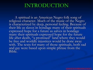 The document discusses spirituals, which are American Negro folk songs of religious character. Spirituals expressed the hopes of slaves for freedom and justice in the afterlife. The texts of many spirituals were based on simple phrases from the Bible. Musically, spirituals show influences from African tribal music like syncopation and call-and-response structures, as well as from European religious and harmonic styles. There are three types of spirituals: lively and rhythmic, solo and choral response, and slow and sustained. The document encourages singing the spiritual "My Lord What a Mourning" with feeling and beautiful tone.