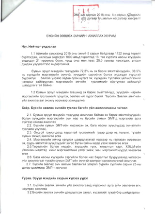 ~. ': ,:3Mf -b'H ,lJ,aprbif-l 21015 OHbl 6-p capblH l £ e,lJ,pvlltiH I f' tJ/1j Ayraap -tywaanblH H3r,lJ,yr33p xaSCpaJlT ~ - / " I 1 : . . . . . . - . . 1 1---..=..__. -.-1' , 5YCVIVlH 38BJl8X 3MLJl!1VlH A}Kl!1JlJlAX >KYPAM 1,1 AII1MrLtlIl1H X3M>K33HA 2015 OHbl 3XHLtlll1 5 capblH 6all1,1J,naap 1122 aMb,lJ, TepenT 6ypn3r,lJ,3>K, H~nXCbIH 3H,IJ,3r,lJ,3n 1000 aMbA TepenTe,lJ, 16, Tas xypT3nx HaCHbl xYYX,IJ,LtlIl1H 3H,IJ,3r,lJ,3n 21 npOMLtlnb 6on>K, ypb,lJ, OHbl MeH ye3c 20,6 xysLtlap H3M3r,lJ,3>K, yncblH ,lJ,YH,IJ,a>K Y3yyn3nT33c eH,IJ,ep 6all1Ha, CYMblH 3pyyn M3H.lJ,LtlIl1H TesYy,lJ,LtlLIIH 72 ,2% Hb 3X 6apV1x 3M3rT31114YY,IJ,V1111H, 38,9% Hb xYYX,IJ,V1I11H M3pr3>KJlV1I11H 3M4rYII1, xYYX,IJ,V1I11H c3prV1l11n>K 6onox 3H,IJ,3r,lJ,3n TyywTa Vi 6yypaxryll1 6all1raa y4paac xeAee OpOH HYTarT 3X, xYYX,IJ,V1I11H TycnaM>K YlI1n4V1Jlr33HV1 111 4aHapblr call1>Kpyynax, M3pr3>KJlV1I11H 3M4V1I11H TycnaM>KLtlll1r oll1pTyynax 3all1nwrYlI1 waap,lJ,naraTall1 6all1Ha_ 1..2 CYMblH 3pyyn M3H,IJ,V1I11H TYSWIIIHA 3X 6apV1x 3M3rT31114YY,IJ" xYYX,IJ,V1I11H HapLtlIl1H M3pr3>KJlLtlIl1H TycnaM>KLtlll1r Y3yyn3x, 3esnex 4Ltlr yyp3r 6yxLtlll1 "5yCLtlIl1H 3esnex 3M4"-LtlIl1H Yll1n a>KLtlnnaraar 3H3XYY >KypMaap 30XLtlwyynHa, ' Xoep. 6YC~H1H 3eBnex 3Ml.j~~H Tycnax 6ar~~H y~n a>K~nnaraaHbl l.j~rn3n 2,1, CYMblH 3pyyn M3HALtlll1H TesYYA3,1J, a>KLtlnna>K 6all1raa 3X 6apLtlx 3M3rT31114YY,IJ,V1I11H 6onoH xYYX,IJ,LtlIl1H M3pr3>KJlLtlIl1H 3M4 Hap Hb 6YCLtlll1H CYMblH 3MT-A M3pr3>1{Ltln apra 3YII1r33p xaHraH a>KLtlnnax 2,2 , 5YCLtlll1H CYMblH 3IV1T-LtlIl1H >KLtlP3MC3H 3X, 6ara HaCHbl xYYX,IJ,YY,IJ,3,1J, 3MH3nrLtlll1H TycnaM>K Y3yyn3x, 2,3, OHLroll1 TOXLtlOn,lJ,on,lJ, ~apanTall1 TycnaM>KLtlll1r ra3ap A33p Hb y3yymK, Tyxall1H CYMblH 3M4111,1J, 3esneree erex 2.4. M3pr3>KJILtlIl1H 3M4LtlA Y3yyn3x waap,lJ,naraTall1 H3PC33P Hb rapracaH >KLtlP3MC3H 3X, CYYPb 3Mr3rT3111 xYYXAYY,IJ,Ltlll1r xarac 6YT3H Call1Hbl e,lJ,ep Y33>K 3esneree erex 2,5.TepenTLtlIl1H 6onoH H~paIl1H , xYYX,IJ,LtlIl1H TYYX, X~HanTbIH KapT, XelJ.M-Ltlll1H Y3n3rLtlll1H Ma~rTa,lJ, Ltl>KLtln M3pr3>KLtlnTHLtlIl1 Y3n3r XLtlll1>K, 3M4 , M3pr3>KLtlnTHYY,IJ,3,1J, 3esneree ernx 2.6, 5ara HaCHbl xYYX,IJ,LtlIl1H C3prlllll1n>K 6onox Hac 6apanTbir 6yypyynaxa,lJ, 4LtlrJl3C3H YlI1n a>KLtlnnaraar Tyxall1H CYMblH 3MT-IIII11H 3M4T3111 xaMTpaH caHaa4naraTall1 a>KLtlnnax 2,7, 5YCLtlll1H 3esnex 3M4 a>KJlblH Tall1naHraa ynLtlpan 6YPLtlll1H cyynlllll1H capblH 25-Hbl ,lJ,OTOP waXLtlMaap 3MI-T Ltlpyyn3x rypaB. 3pyyn M3HA~~H ra3pblH xyn33x YYP3r 3.1 , 5YCLtlll1H 3esnex 3M4Ltlll1H YlI1n a>KLtlnnaraaH,IJ, M3pr3>KLtln apra 3YII1H 3esneree er4 , xaMTpaH a>KLtlnnax 3,2 ,5ycLtlIl1H 3esnex 3M4Ltlll1H ,lJ,3swyync3H caHan , XYC3nTLtlll1r TyxaVi 6yp WLtlLII,lJ,S3pn3X