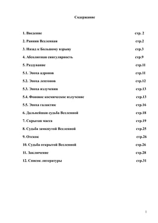 Документ обсуждает концепции возникновения и расширения вселенной, основываясь на теории большого взрыва и связанных научных исследованиях. Он рассматривает вопросы возраста вселенной, затрагивая различные подходы и результаты, полученные учеными. Основное внимание уделяется проблеме соотношения между различными методами измерений, которые могут привести к разным значениям возраста вселенной.