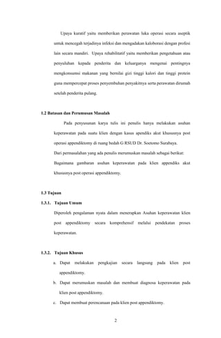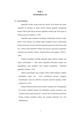 Dokumen tersebut membahas tentang anatomi, patofisiologi, dan asuhan keperawatan pada kasus appendiks akut pasca operasi appendiktomy. Secara ringkas, appendiks adalah organ kecil yang terletak di caecum yang dapat mengalami peradangan akibat penyumbatan yang dapat menyebabkan nyeri. Operasi appendiktomy dilakukan untuk mengangkat appendiks yang terinfeksi. Asuhan keperawatan meliputi pengkajian, perencanaan, pel
