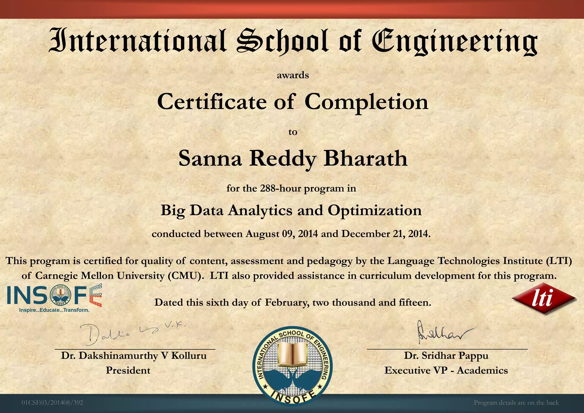 The International School of Engineering awarded Sanna Reddy Bharath a Certificate of Completion for completing a 288-hour Big Data Analytics and Optimization program between August 09, 2014 and December 21, 2014. This program was certified by the Language Technologies Institute of Carnegie Mellon University, who also assisted in curriculum development. The certificate is signed by the President and Executive VP - Academics of the school and dated February 6, 2015.