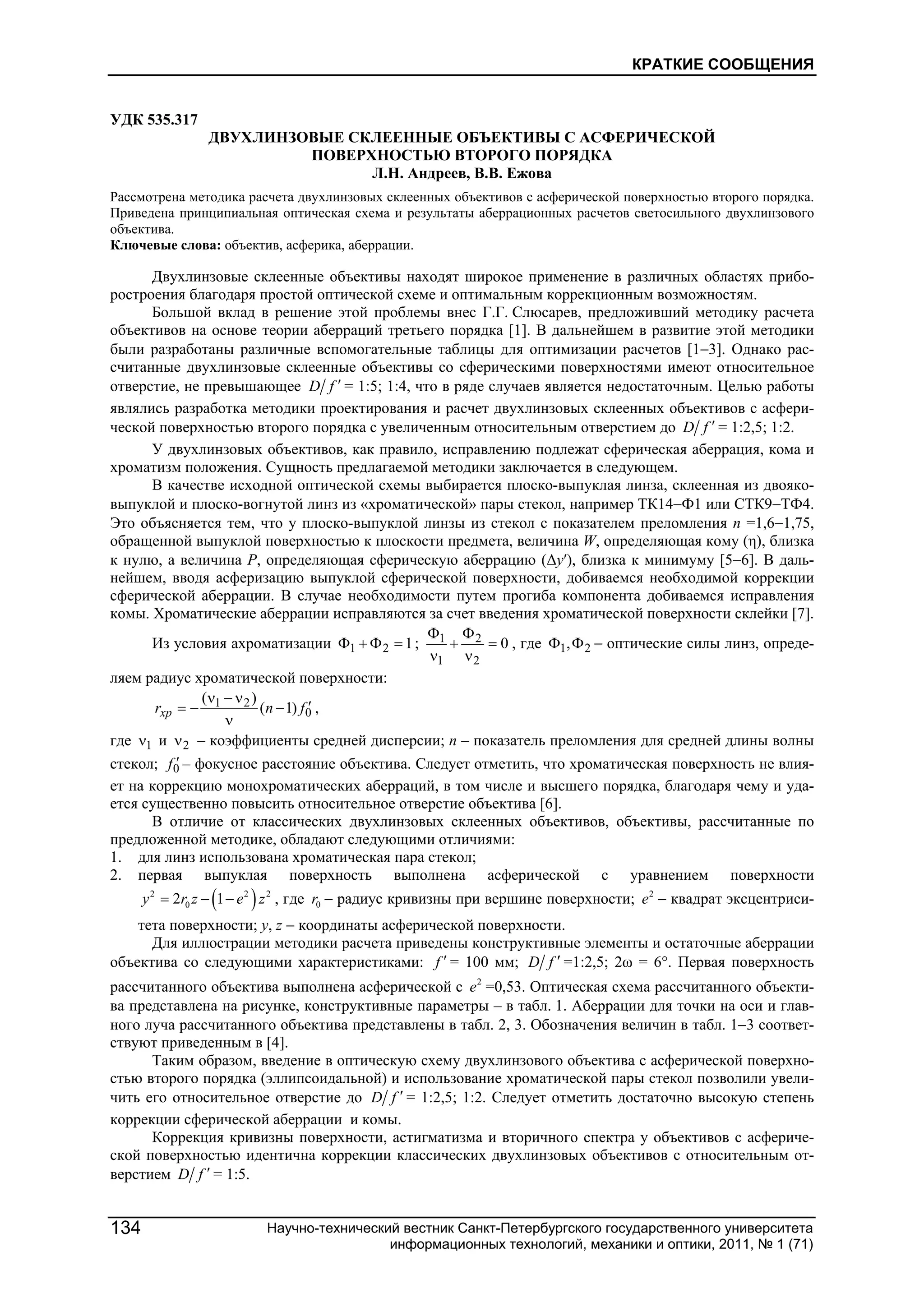 Документ описывает методику расчета двухлинзовых склеенных объективов с асферической поверхностью второго порядка, обеспечивающую увеличение относительного отверстия до 1:2,5. Приведены результаты аберрационных расчетов и конструктивные параметры нового объектива, который обладает высокой степенью коррекции по сравнению с классическими аналогами. Основное внимание уделяется оптимизации оптической схемы и коррекции сферической аберрации и комы.