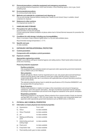 3) The product should be stored in a cool, well-ventilated place between 2-8 degrees Celsius and handled with gloves and eye protection to avoid dust inhalation or skin/eye contact.