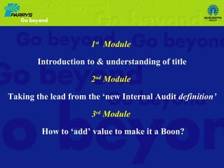 The document discusses the evolving role of internal auditors, emphasizing how their perception can shift from being seen as a 'bane' to a 'boon' through value addition. It highlights the transition from traditional auditing practices to a more integrated and consultative approach, where auditors not only assure compliance but also add strategic value to organizations. Key attributes for success involve building competencies, effective communication, and aligning with organizational objectives to enhance overall governance and risk management.