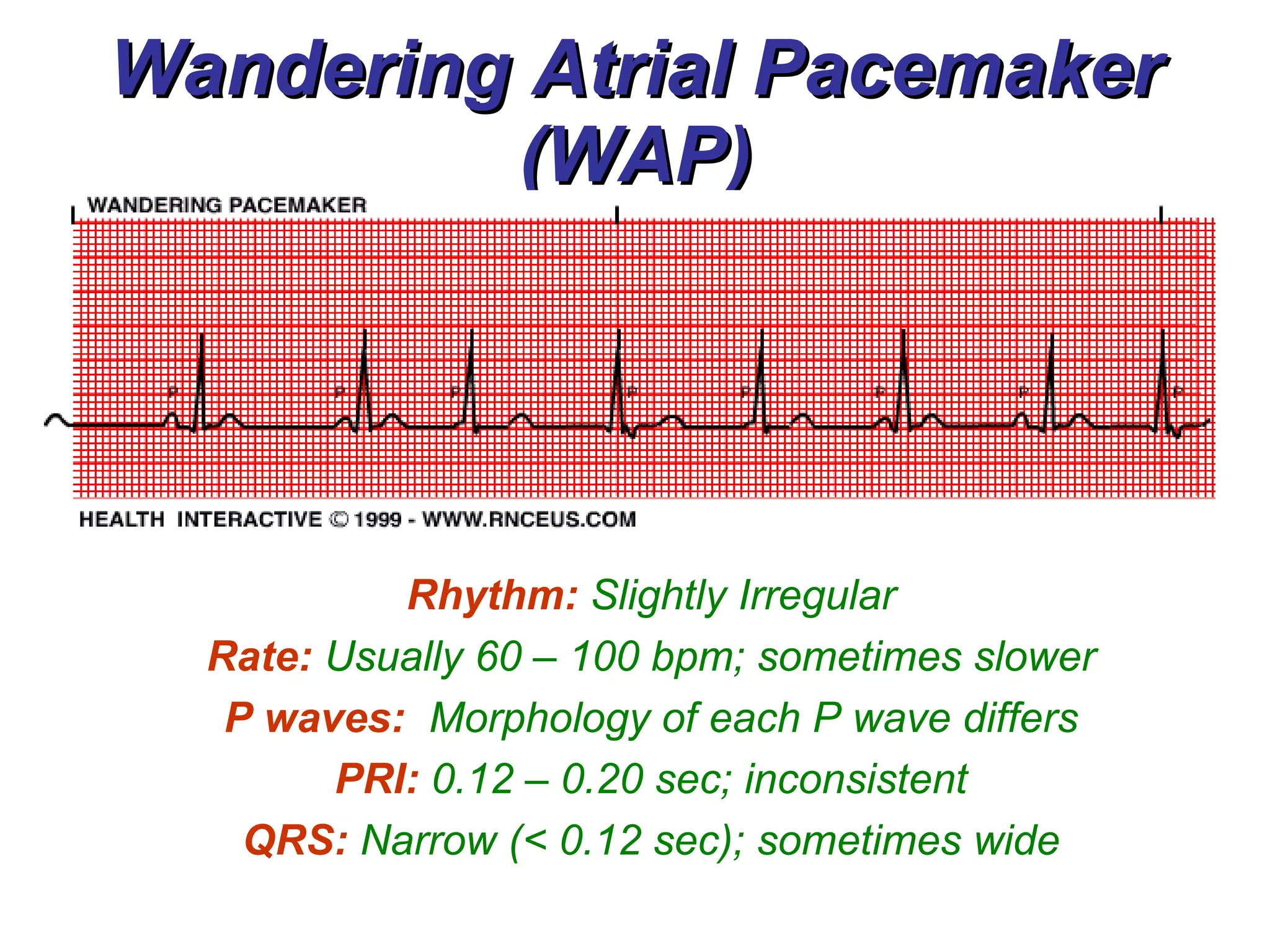 The document provides information about various types of atrial rhythms, including wandering atrial pacemaker rhythm, premature atrial contractions, supraventricular tachycardia, atrial flutter, and atrial fibrillation. It describes the characteristics of each rhythm such as rate, P wave morphology, causes, and treatment options.