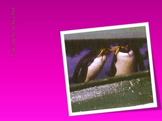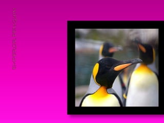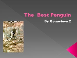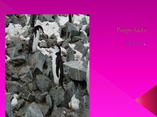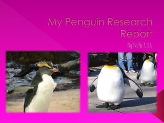 The document provides information about three penguin species: macaroni penguins, emperor penguins, and chinstrap penguins. Macaroni penguins can spend up to 4-5 months at sea, weigh up to 13 pounds, and have yellow feathers on their heads. Emperor penguins are the largest species at 35-51 inches tall and 70-90 pounds, and can dive down 1,700 feet below water. Chinstrap penguins are the most numerous species, have a black line under their chin, and grow up to 27-30 inches and 9-14 pounds.