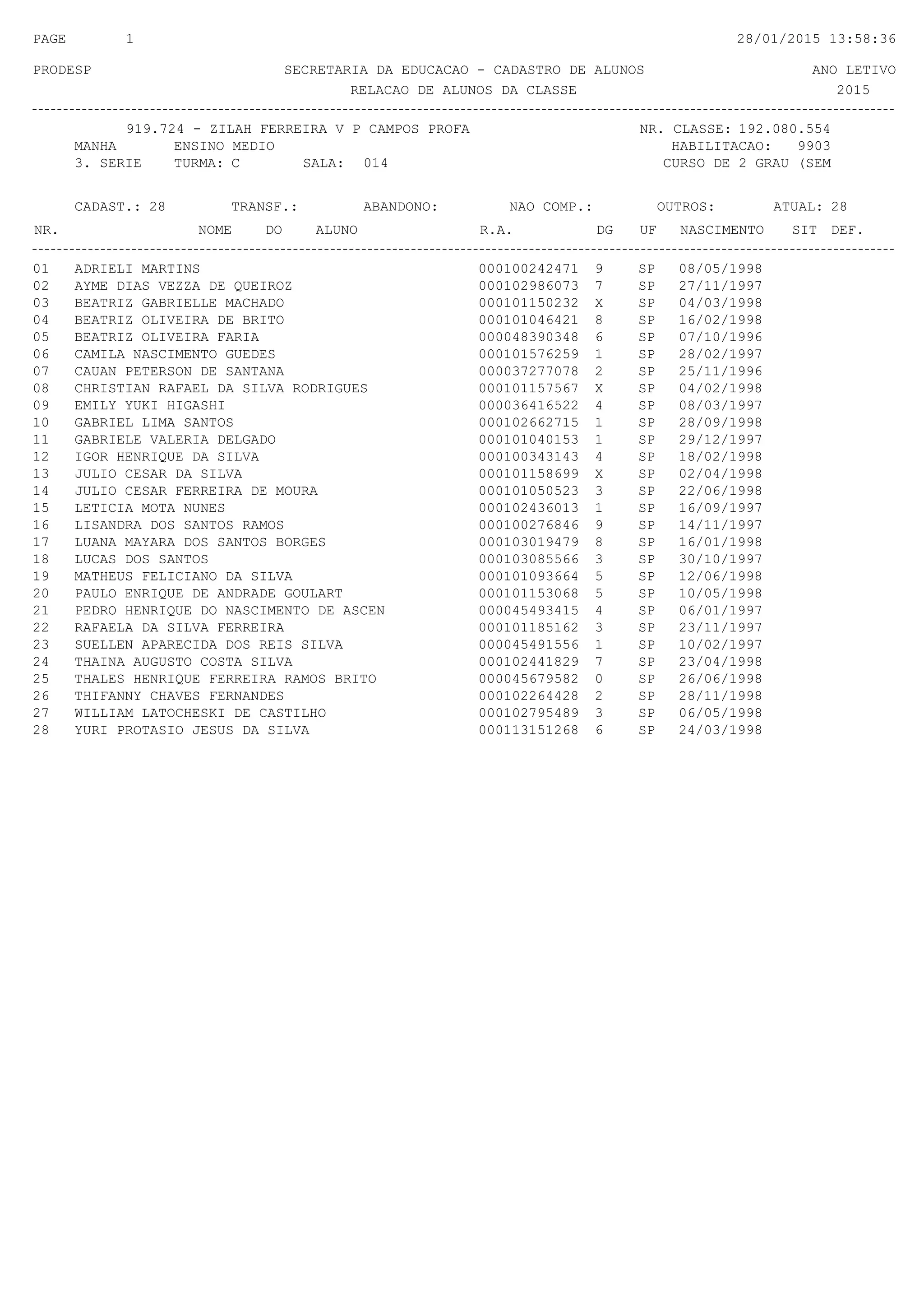 This document is a roster listing 28 students in a class. It includes each student's name, registration number, state of birth, and date of birth. The class is a 3rd year high school class that meets in the morning. The roster was generated on January 28, 2015 by the Secretariat of Education student registration system.