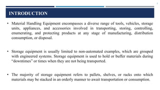 This document discusses various types of cold storage equipment and material handling equipment used in warehouses. It describes racks, shelves, mezzanines, and other storage systems used for organizing inventory. It also outlines different types of storage configurations like block stacking, wide aisle racking, double-deep racking, narrow aisle racking, drive-in racking, and satellite racking. Additionally, it covers the equipment used for horizontal and vertical movement of inventory like forklifts, tow tractors, AGVs, lift tables, and conveyor belts. Specialized equipment with attachments for efficient handling of different cargo are also presented.