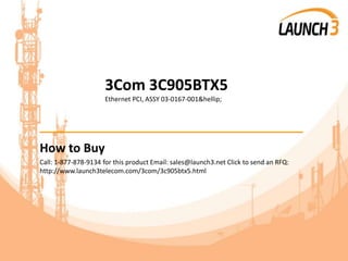 This document provides information about purchasing a 3Com 3C905BTX5 Ethernet PCI card from Launch 3 Telecom. It describes the product, payment and shipping options, warranty, and additional services offered by Launch 3 Telecom such as repairs, maintenance contracts, and equipment deinstallation. Customers can purchase the 3C905BTX5 by phone, email, or online form and receive same-day shipping with tracking for orders placed before 3PM EST.