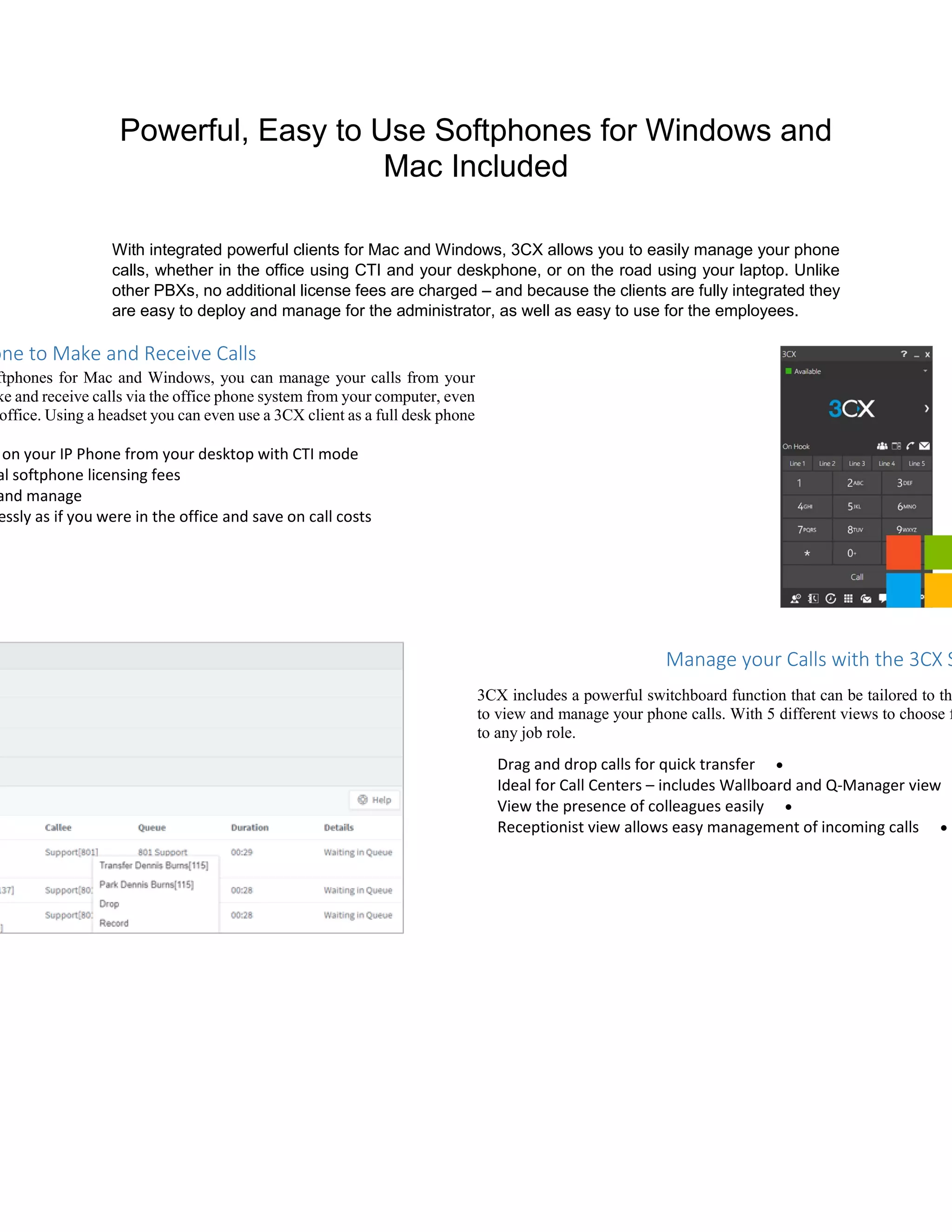 1) 3CX softphone clients for Windows and Mac allow users to manage calls from their computer whether in or out of the office using headset as a full deskphone.