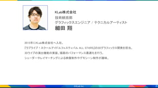 This document discusses updates to 3D live performance rendering in Love Live! School Idol Festival All Stars (SIFAS) using shaders. It describes how vertex shaders were used to animate butterfly wings flapping and fans waving to reduce CPU load while maintaining production efficiency. Particle systems were combined with custom vertex streams and shader modifications to extend the single butterfly implementation to multiple butterflies. GPU instancing was also proposed as an alternative solution.