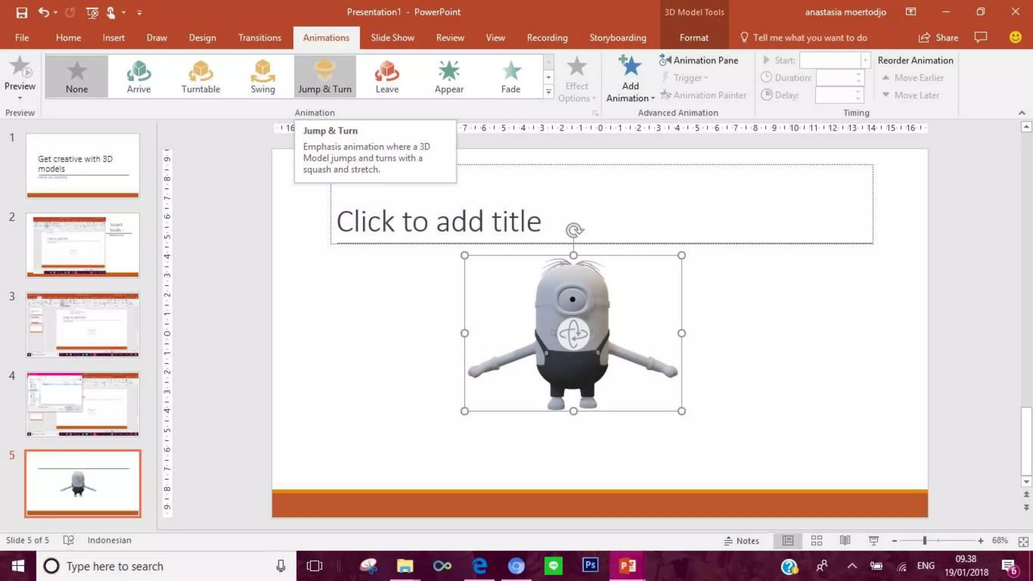 This document discusses how to insert and animate 3D models in Office 365. It provides information on the file formats supported for inserting 3D models from files, such as FBX, OBJ, 3MF, PLY, STL and GLB. It also explains that double clicking an inserted 3D model will open an animation pane where animations can be viewed and controlled. An example of an animated 3D object is given to demonstrate this functionality.