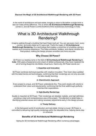 3D Power is a leading provider of 3D architectural walkthrough rendering in India, offering innovative and high-quality virtual tours that help clients visualize buildings before they are constructed. Their client-centric approach ensures detailed and timely renderings, enhancing communication and marketing efforts for architects and real estate developers. By identifying design flaws early in the planning process, 3D walkthroughs ultimately save time and costs.