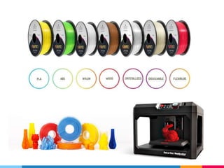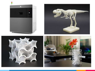 The document discusses essential considerations for creating 3D models suitable for printing, highlighting common printability issues such as solidity, flipped faces, and wall thickness. It also compares various materials like ABS/PLA plastics, UV-cured resin, nylon, and full-color sandstone, detailing their uses, benefits, and limitations. Key printing concepts such as support structures, infill percentages, and post-processing requirements are emphasized for successful 3D printing.