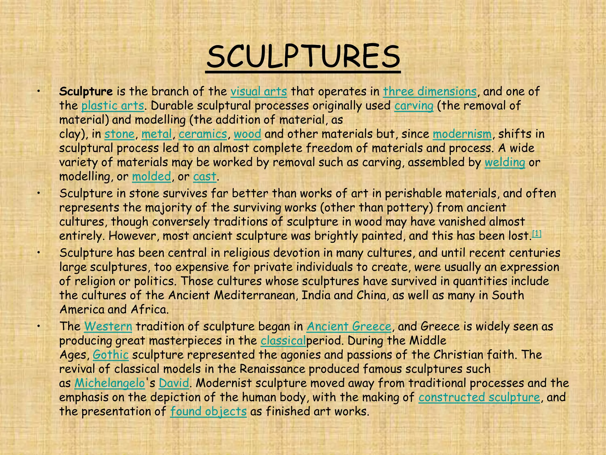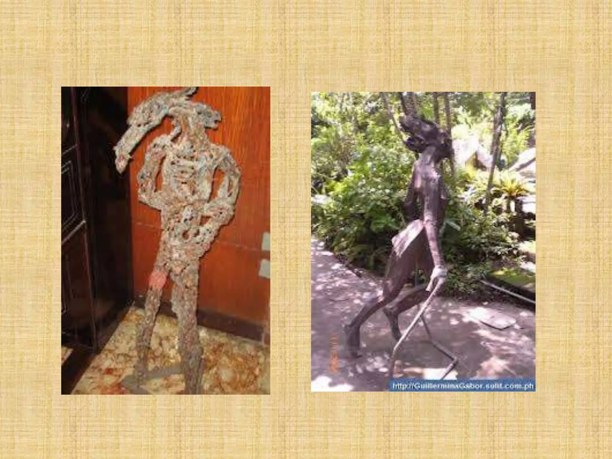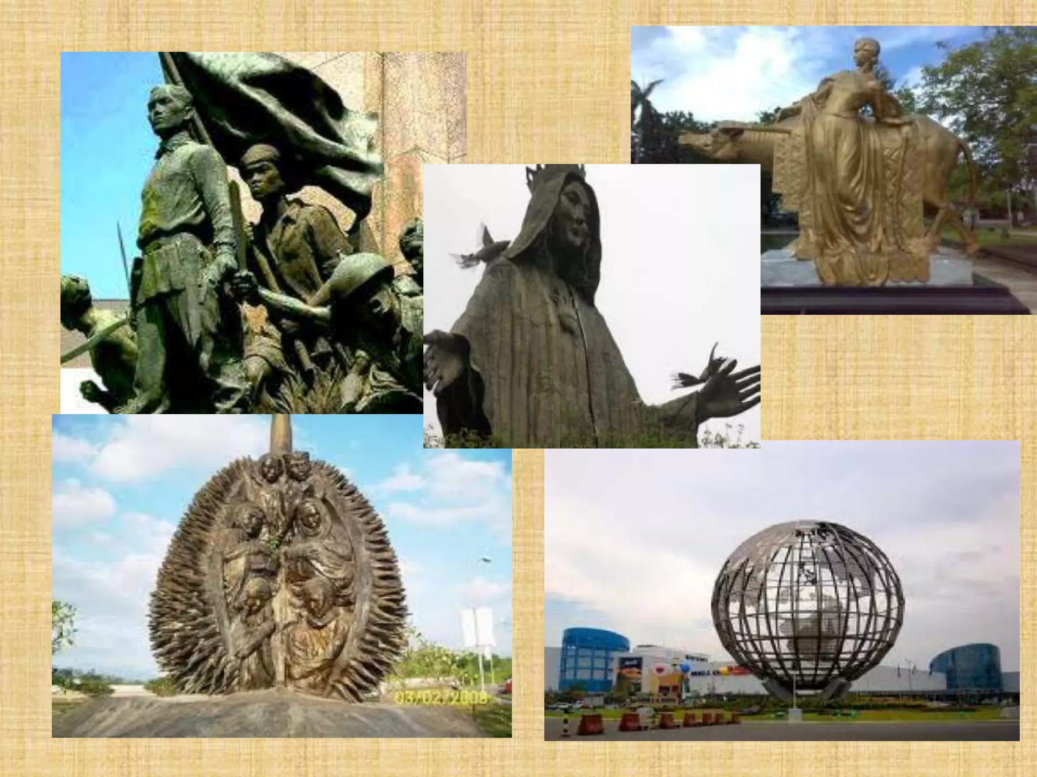 Sculpture and 3D assemblage involve creating three-dimensional artwork using various materials and techniques. Sculpture has been an important part of religious and political expression throughout history in many cultures. Notable sculptors mentioned include Napoleon Abueva, Arturo Luz, Guillermo Tolentino, and Abdulmari Asia Imao, known for their sculptures highlighting Filipino culture and history. 3D assemblage involves combining found objects into artistic compositions and originated in the early 20th century works of artists like Picasso, Duchamp, and Rauschenberg.