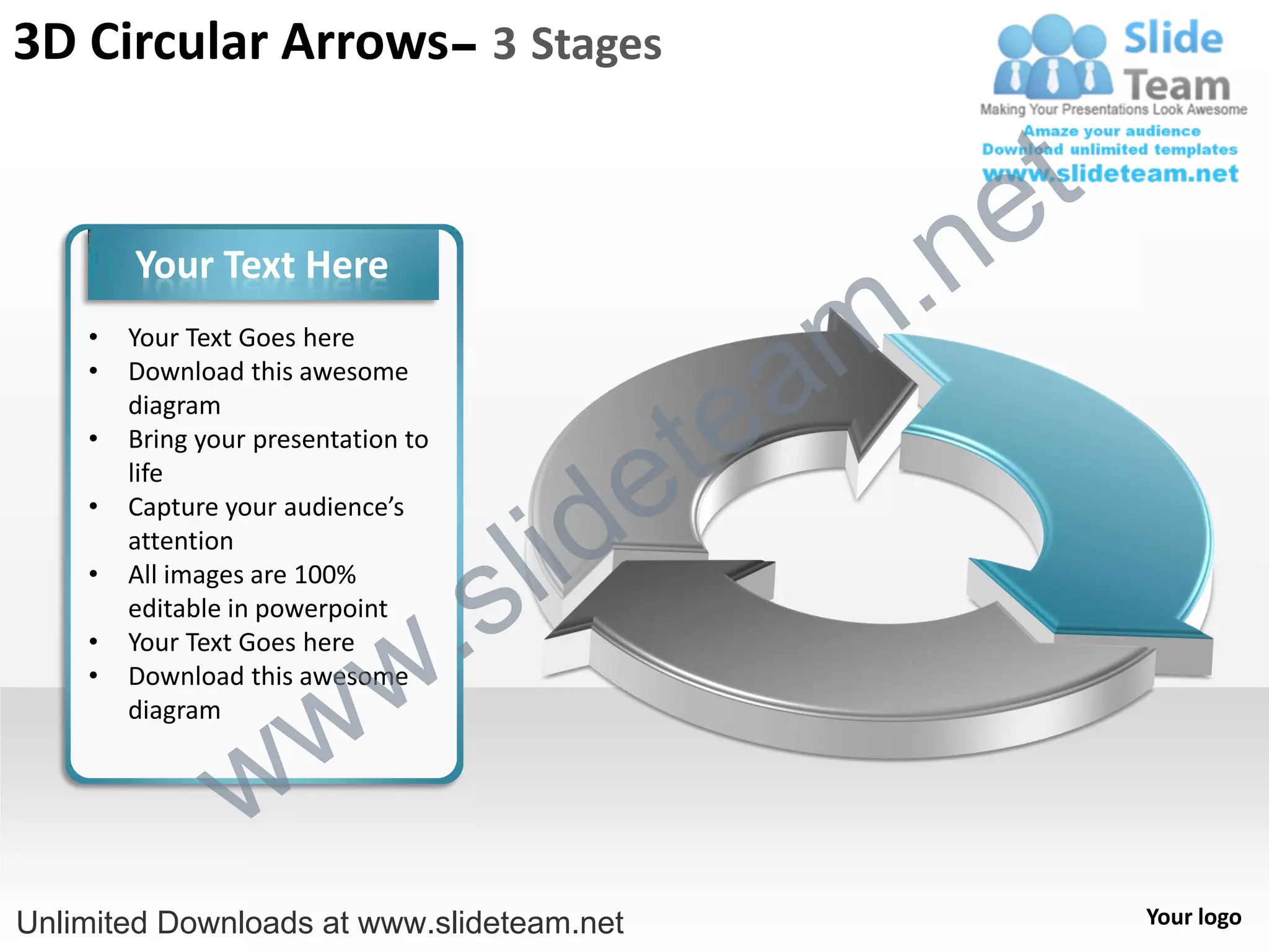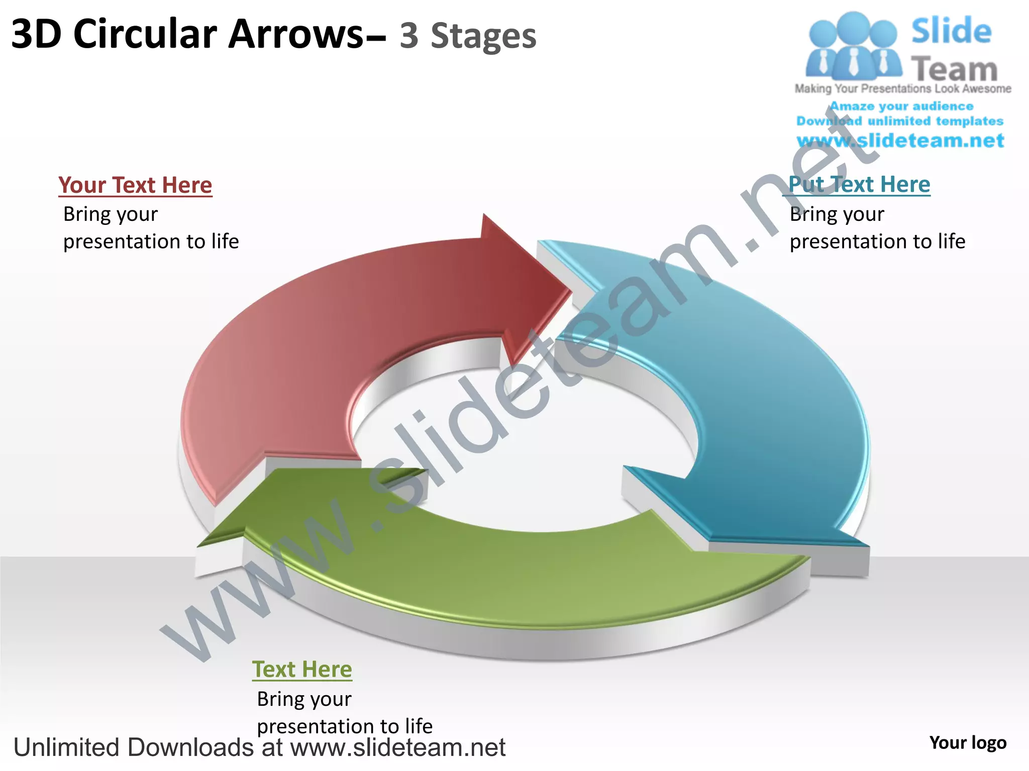 The document describes a 3D circular arrow diagram with three stages. It promotes bringing presentations to life using downloadable diagrams from a website. The diagrams allow editing text and images in PowerPoint. Individual objects can be ungrouped and edited by color, size, and orientation. All images are fully editable to suit the user's needs.