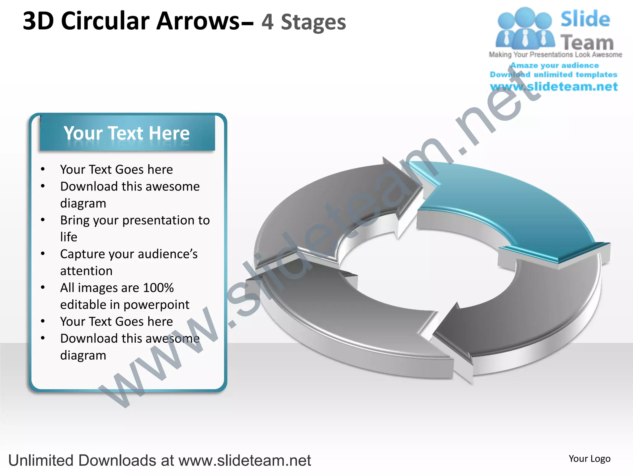 The document describes a 4-stage 3D circular arrows diagram for presentations. It includes the following key points: