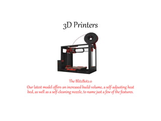 This document advertises 3D printing products and accessories, including the BlitzBot2.0 3D printer which has an increased build volume and self-adjusting heat bed. It also offers various 3D printing filaments and 3D pens, and provides a link to their website for more information.