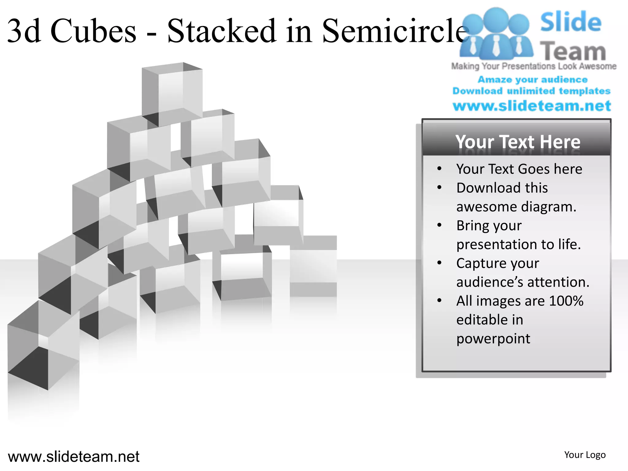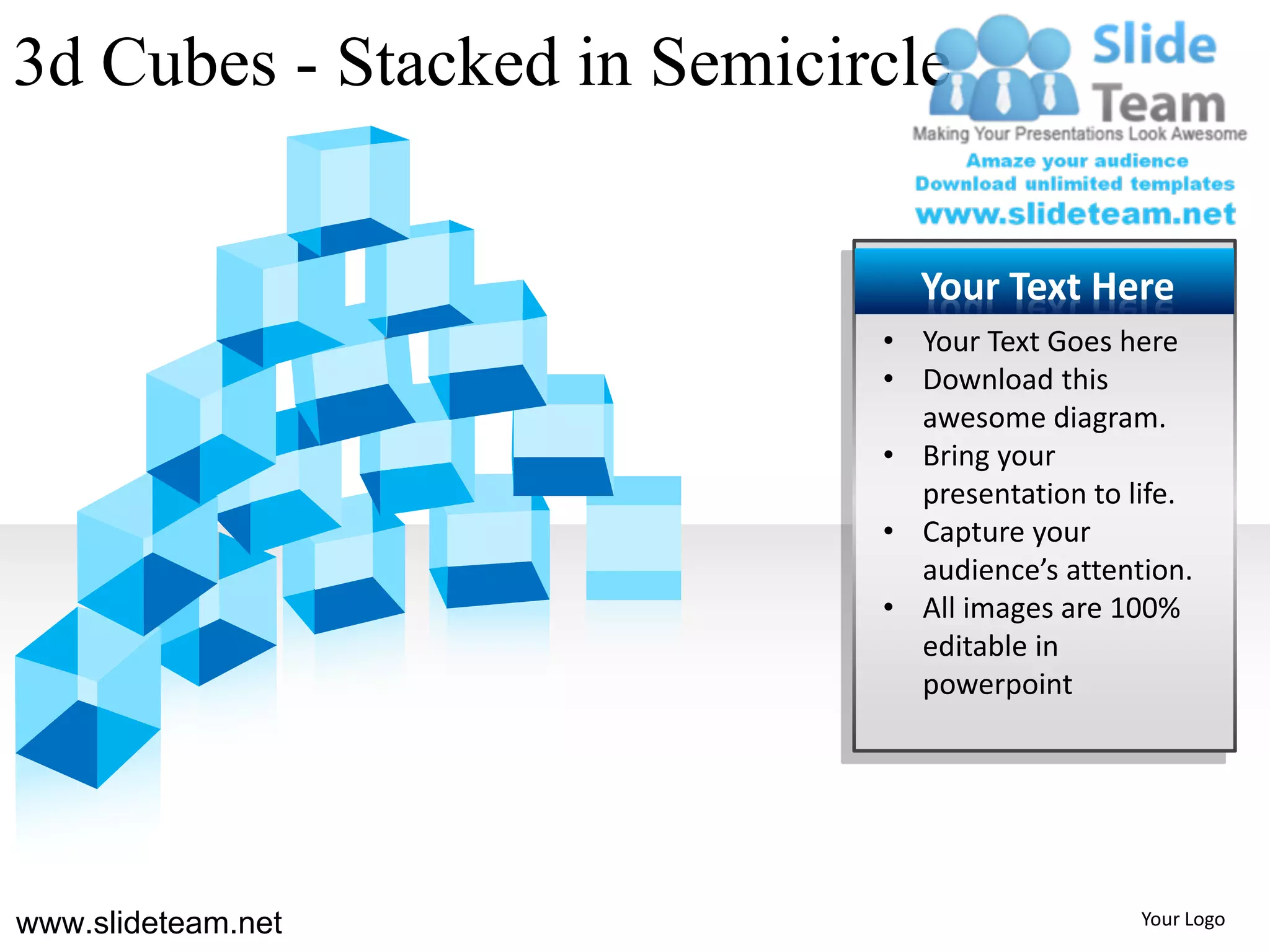 The document advertises stock 3D cube diagrams that can be downloaded and edited in PowerPoint. Key features include editing colors, sizes, and orientations of icons to suit presentations and capturing audience attention. Images are fully editable in PowerPoint by ungrouping objects and changing colors through the Format Shape dialog box.