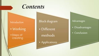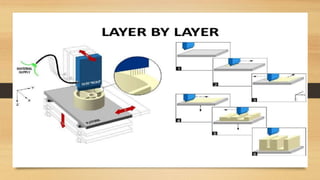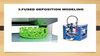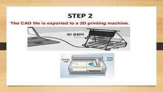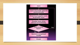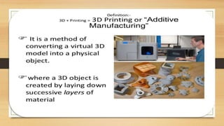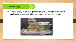 This document discusses the components and process of 3D printing. It includes a block diagram of the components which are an Arduino Mega 2560 microcontroller, L293D motor driver, stepper motor, and extruder. It describes the printing materials of ABS and PLA. It explains the methods of 3D printing including fused deposition modeling and stereolithography. The advantages are listed as rapid prototyping, clean process, and ability to produce complex shapes, while disadvantages include slow speed and limited strength of components.
