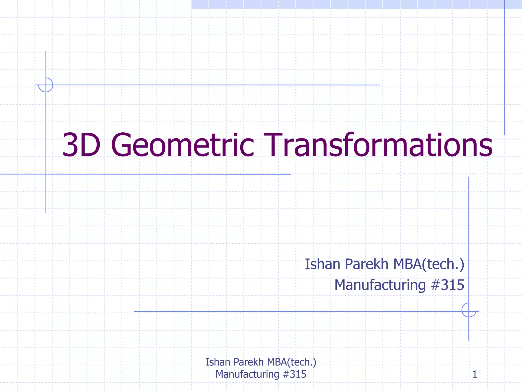 The document discusses 3D geometric transformations including rotation and reflection. It explains that transformations move points in space and can be expressed through 4x4 matrices. Specifically, it covers rotating objects around axes, conventions for right-handed vs left-handed systems, and how to perform rotations around arbitrary axes through a series of translations and rotations. It also discusses reflecting objects across planes by treating it as a scaling by -1 along one axis and provides AutoCAD commands for rotations and reflections.