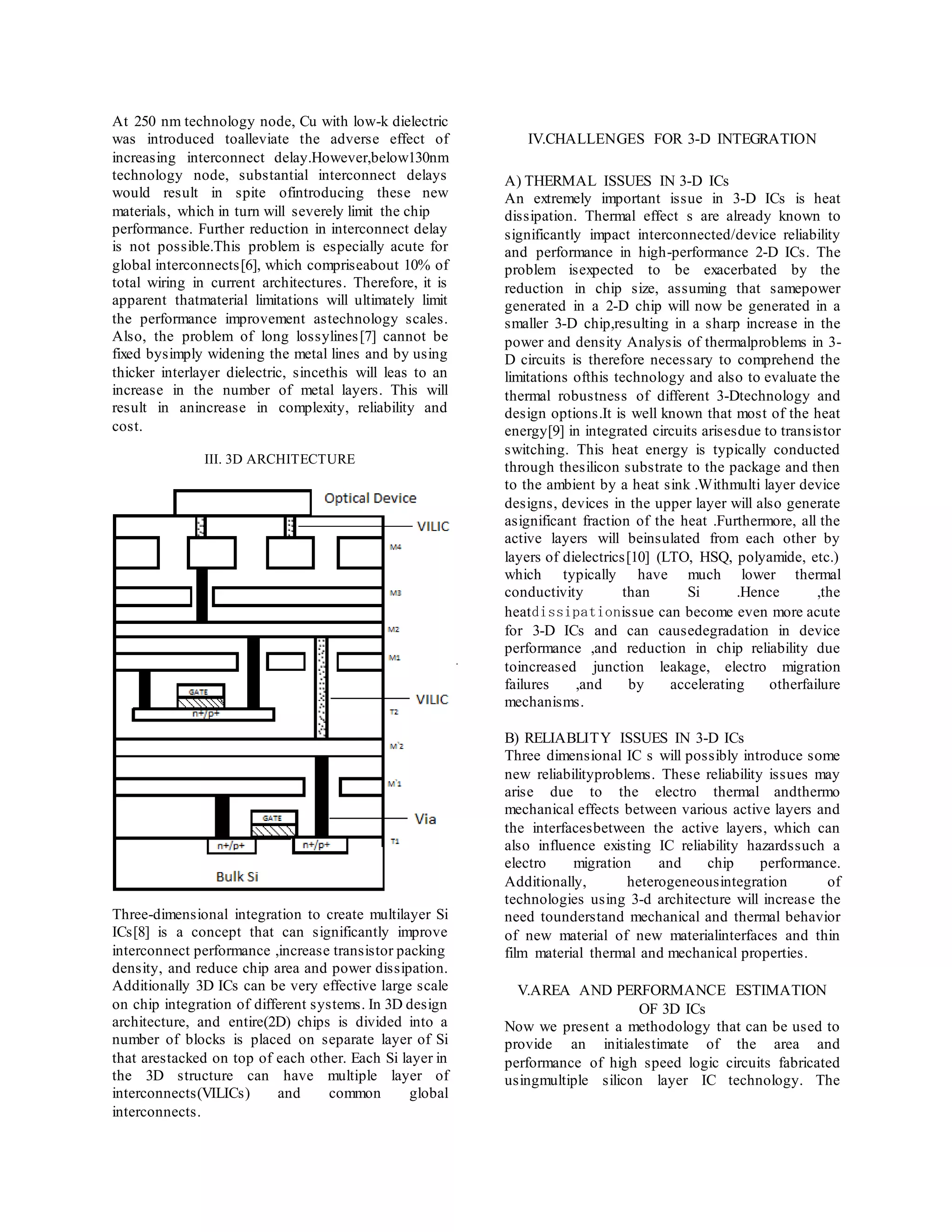 3D ICs can alleviate problems caused by long interconnects in traditional 2D chips by stacking layers and using short vertical interconnects between layers. This approach improves chip performance and density. However, 3D ICs also introduce thermal and reliability challenges due to heat dissipation issues and stresses between layers that must be addressed. Rent's rule can be used to estimate performance improvements from 3D architectures by analyzing reductions in total interconnect length.