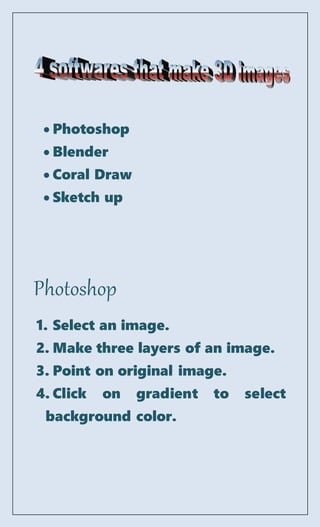 This document discusses several software that can be used to make images appear 3D: Photoshop, Blender, Coral Draw, and SketchUp. For each software, it provides steps on how to take a 2D image and manipulate it using tools in the software to create a 3D effect. The steps include using layers, transformations, materials, textures, and blending to add depth and realism to make the image appear three-dimensional.