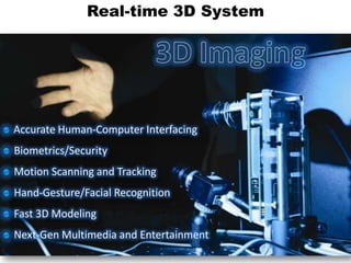 The 3D Imaging Lab at the University of Kentucky develops real-time 3D acquisition systems that can capture 3D data at 120 frames per second for applications such as biometrics, motion tracking, gesture recognition, 3D modeling, and entertainment; their hybrid system is able to fuse 3D data from multiple views with 26 times reduction in noise compared to traditional stereo methods; one project involves 3D fingerprint scanning that flattens and fuses 3D fingerprints into 2D representations for improved matching performance.