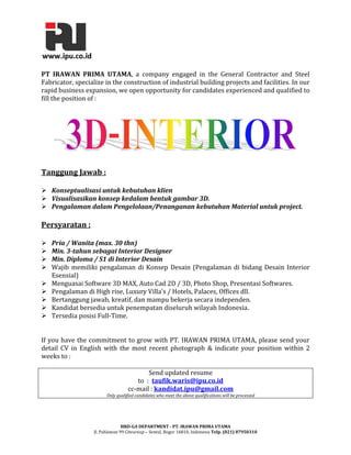 PT Irawan Prima Utama, a general contractor and steel fabricator company based in Bogor, Indonesia, is seeking candidates for an Interior Designer position. Responsibilities include conceptualizing client needs, visualizing concepts in 3D drawings, and managing material requirements for projects. Requirements include a maximum age of 30, a minimum 3 years experience as an Interior Designer, a diploma or bachelor's degree in interior design, proficiency in 3D MAX, AutoCAD, Photoshop and presentation software, experience in high rise buildings, hotels, villas and offices, being responsible, creative and able to work independently, and willingness to be located anywhere in Indonesia. Candidates should send an English resume with