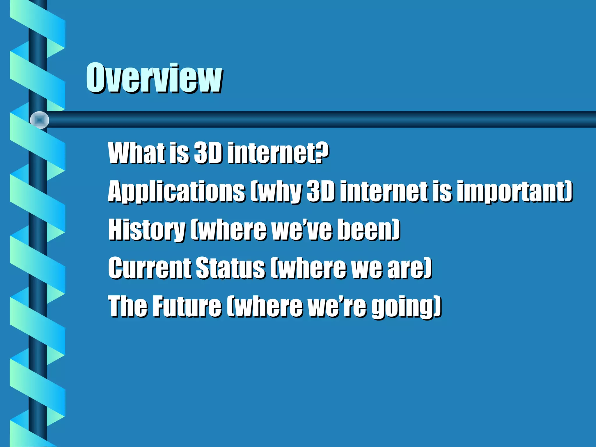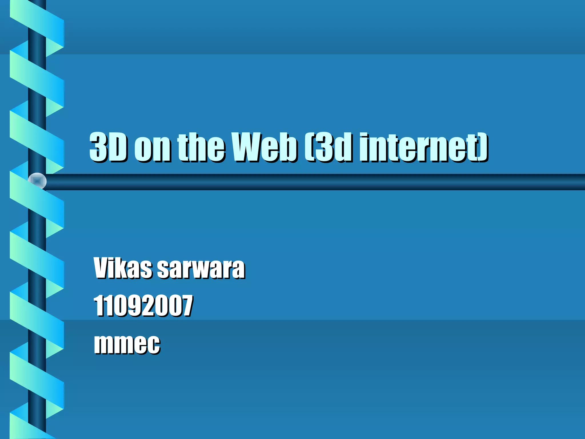 This document provides an overview of 3D on the web (3D internet). It discusses what 3D internet is, the applications and importance of 3D content on the web, the history and current status. Key enablers for 3D on the web have been increased bandwidth and computer processing power. 3D can be used for e-commerce, training, games, entertainment, social interaction, and education. The document also discusses technologies, design, animation, interactivity, and content creation for 3D on the web. A simple example of a 3D forest walk site is provided to illustrate how easy it can be to create basic 3D web content.