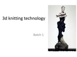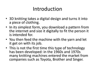 This document discusses 3D knitting technology. It describes how 3D knitting machines can digitally design and produce customized clothing. It then discusses different types of 3D knitted fabrics like multiaxial fabrics produced on special warp knitting machines with layers of yarns at different angles, and sandwich/spacer fabrics made of two separate fabrics connected by yarns or knitted layers. The document also covers companies involved in 3D knitting like Nike, UnderArmour, Karl Mayer, Shima Seiki, Stoll, and Santoni.