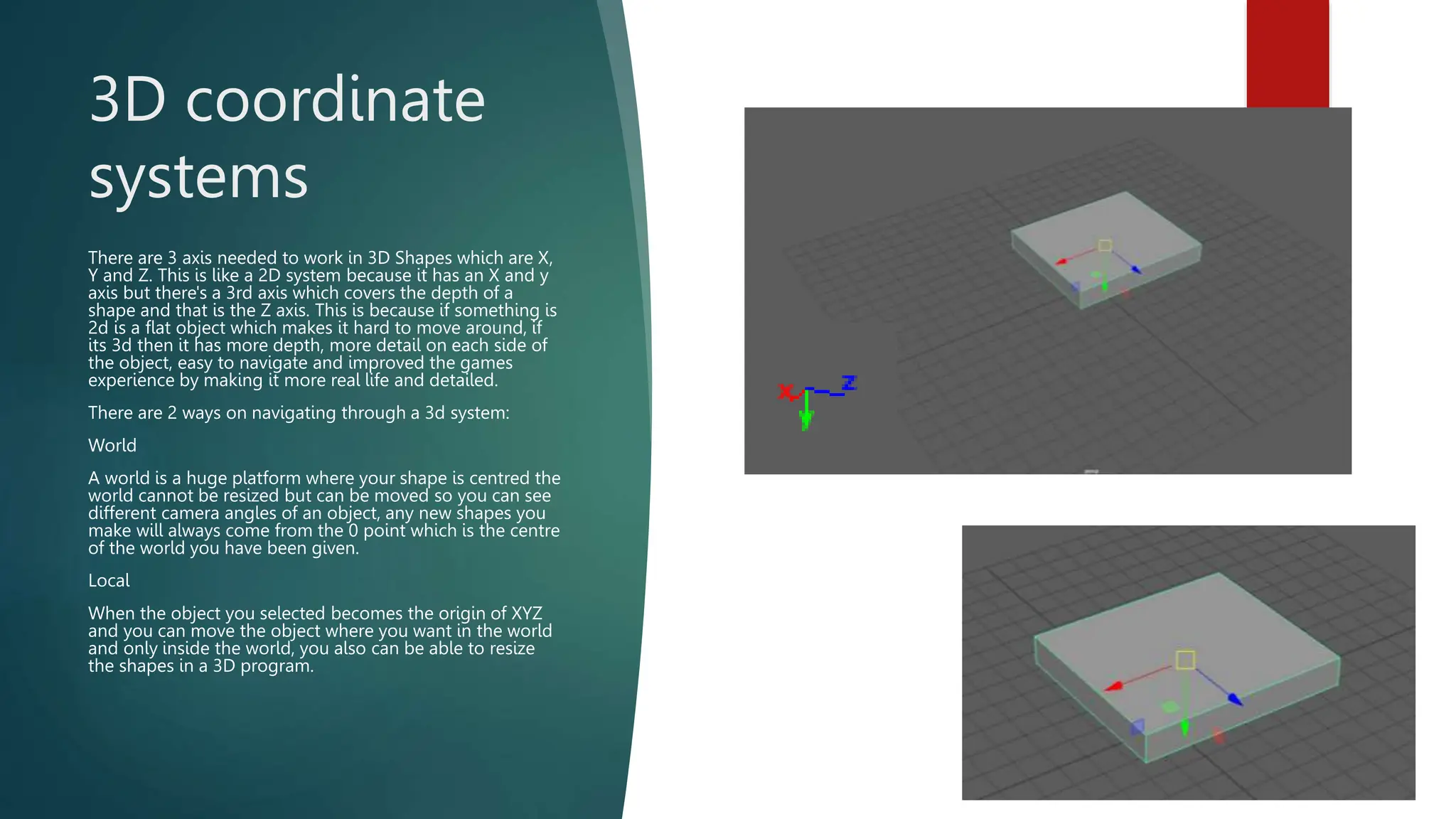 The document discusses 3D coordinate systems and their application in modeling, emphasizing the three axes (x, y, z) that define depth and navigation within 3D environments. It covers various modeling techniques, including polygonal and spline modeling, and essential concepts like UV coordinates, vertex color information, and collision hulls, all critical for game development. Additionally, it highlights the importance of balancing poly counts to optimize rendering and processing based on the target platform, alongside the use of modular meshes for efficient environment creation.