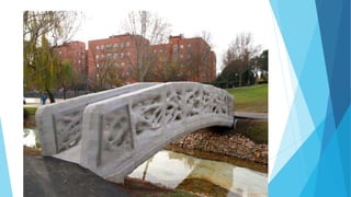 This document discusses 3D printing technology in construction. It provides an overview of 3D printing and how the process works to build objects layer by layer. The history and first uses of 3D printing in construction are described, including building the first 3D printed house in France in 24 hours. Comparisons are made between 3D printing and traditional construction methods, noting advantages of 3D printing like lower costs, waste, and time. Potential future benefits are outlined, such as new design possibilities, precision, and remote construction. Examples of a 3D printed bridge and canal are provided. Disadvantages and challenges are also acknowledged.