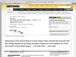 The document discusses the evolution of 3D printing technology, tracing key milestones from the first printed objects to modern developments like 3D-printed organs and adapters for children's construction toys. It highlights the role of platforms such as Shapeways and Thingiverse in enabling public access to 3D models and the significance of the free universal construction kit in promoting interoperability among construction toys. The document concludes by addressing the broader implications of technological advancements on knowledge structures and society.