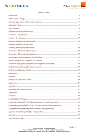 The document is a comprehensive report analyzing patenting activity surrounding 3D printing technology from 1990 to 2014. It covers various aspects such as publication trends, key companies, and patent categorization based on technology, materials, and applications. The report emphasizes the growth of innovation in 3D printing and provides insights for industry stakeholders without offering business advice.