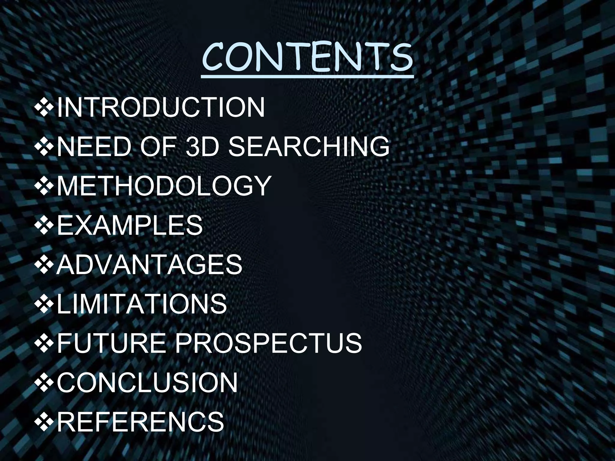 This document discusses 3D searching and 3D search engines. It begins by introducing 3D searching as a method to search for 3D objects in a database based on a query. It then discusses the need for 3D search engines, the methodology which involves query formulation, search process, and search results. Examples of specific 3D search systems from Purdue and Princeton are provided. The advantages, limitations, and future prospects of 3D searching are outlined before concluding that 3D search engines can help find 3D models online, but their use is currently limited.
