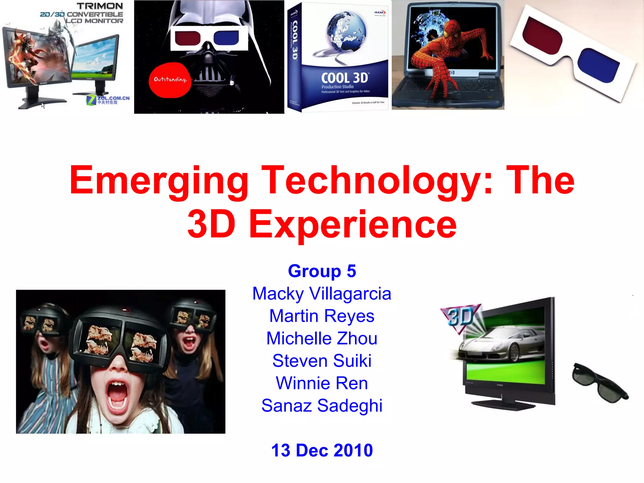 The document discusses emerging 3D technology, including its technical aspects, trends, applications, costs and benefits, ethical implications, and potential impacts on nation-building. Technically, 3D works through high screen refresh rates and infrared signals received by 3D glasses. Applications include 3D TVs, movies, games, videos and mobile devices. While costs are currently high, 3D may boost industries and education. However, health and privacy issues require consideration.