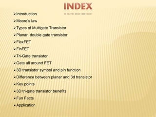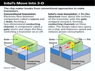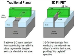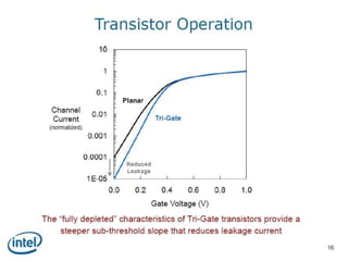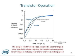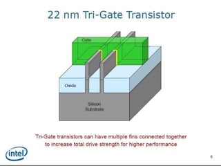 This document discusses the evolution of transistor technology, focusing on the development of tri-gate transistors. It describes how tri-gate transistors allow Moore's Law to continue by addressing issues like short channel effects that arise at smaller scales. The document outlines different types of multigate transistors and explains the advantages of tri-gate transistors, such as reduced power dissipation and better control over leakage current. It also provides some examples of how small 22nm transistors are in comparison to everyday objects.