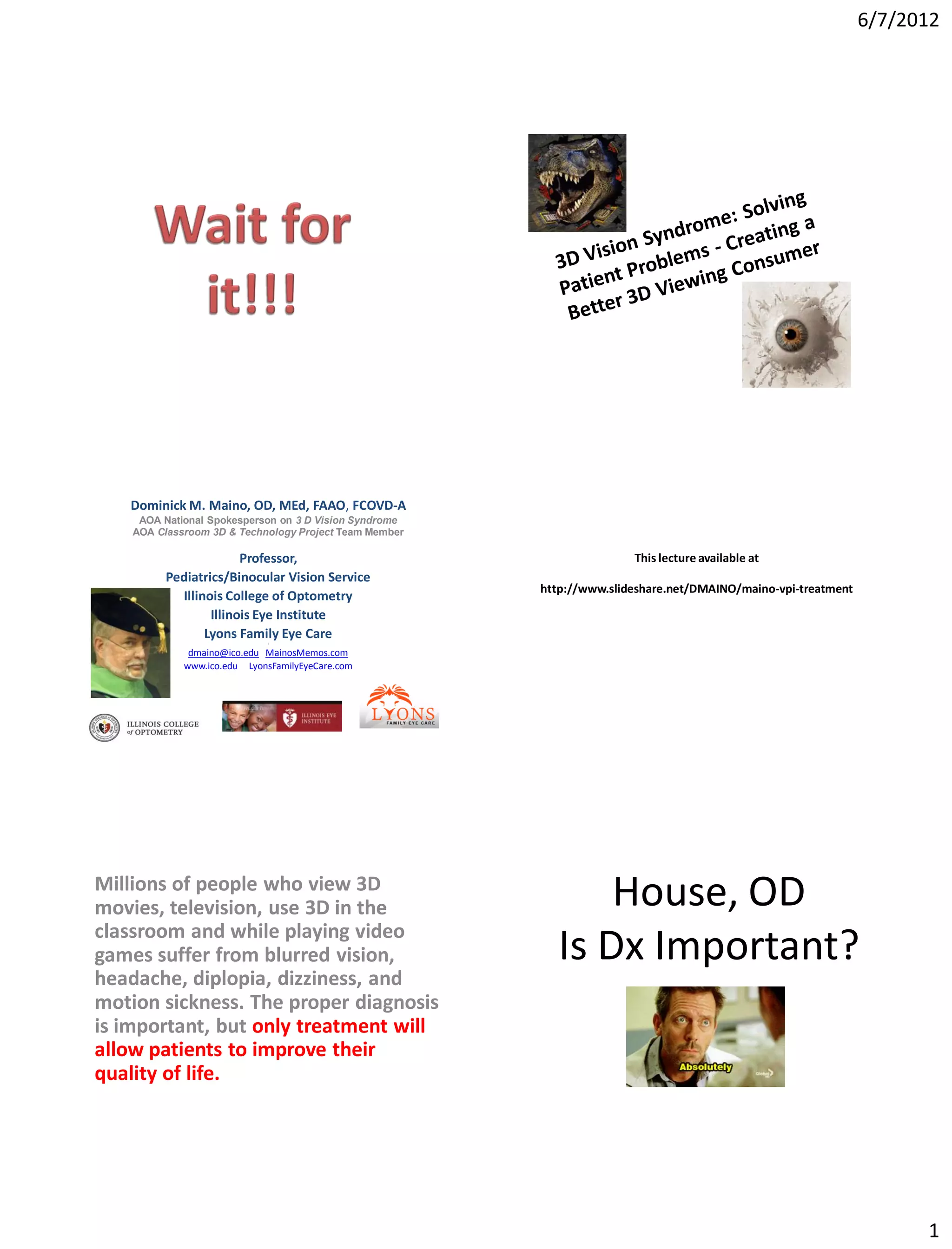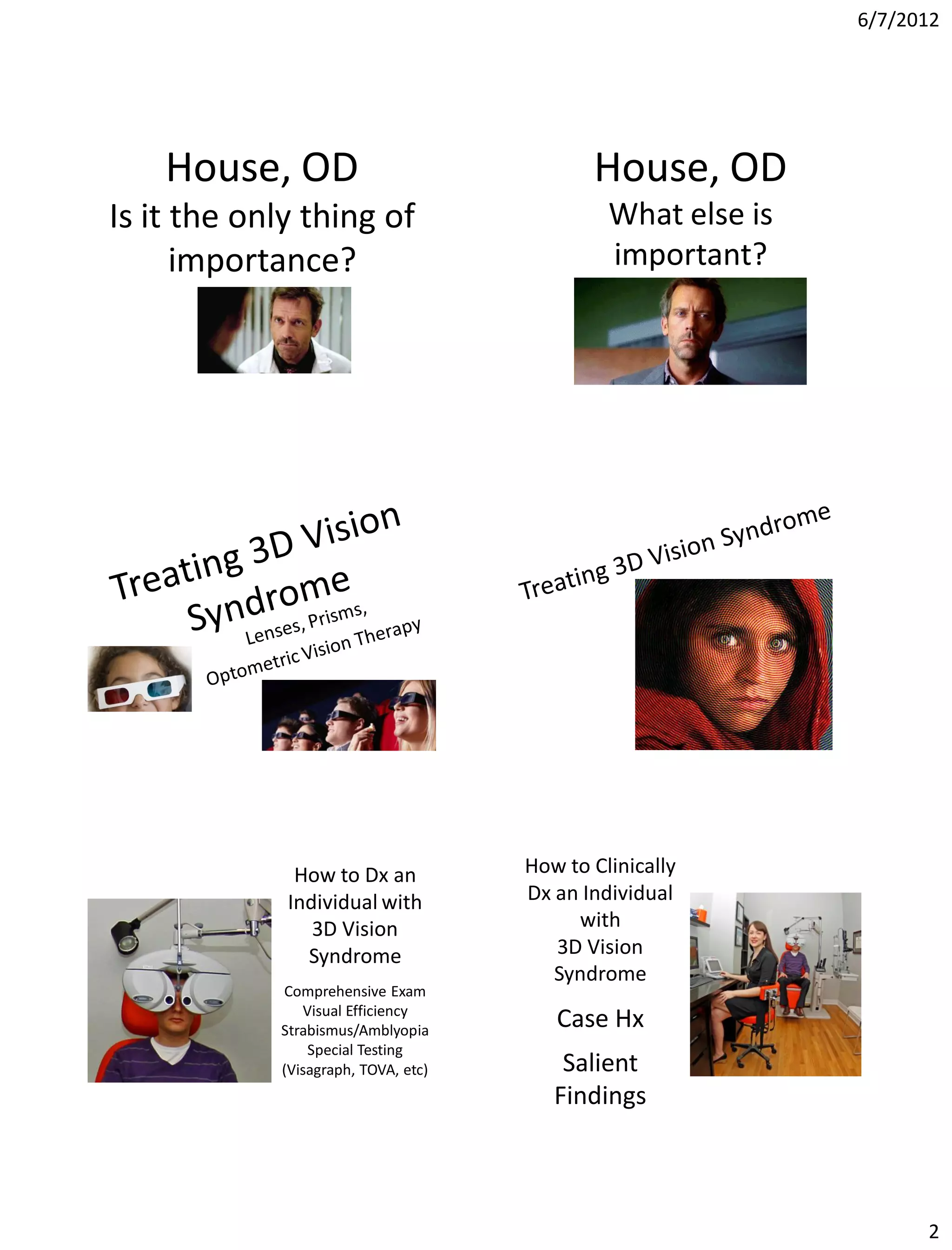 This document discusses 3D vision syndrome, its diagnosis, and treatment through optometric vision therapy. It begins by outlining the common symptoms experienced by millions who view 3D content. Proper diagnosis is important, but treatment through vision therapy is needed to improve patients' quality of life. The document then provides details on diagnosing individuals with 3D vision syndrome through a comprehensive eye exam and discusses a case study of a patient who was successfully treated with 8 visits of vision therapy over several months to resolve her symptoms.