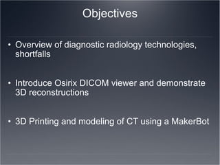This document discusses 3D radiologic visualization and modeling using various technologies. It introduces the Osirix DICOM viewer which allows 3D reconstruction of imaging studies. The document demonstrates how CT scans can be 3D printed using a MakerBot 3D printer by exporting data from Osirix, cleaning up the 3D model, and generating machine code for the printer. Potential applications of 3D modeling include patient education, surgical planning, and medical education.
