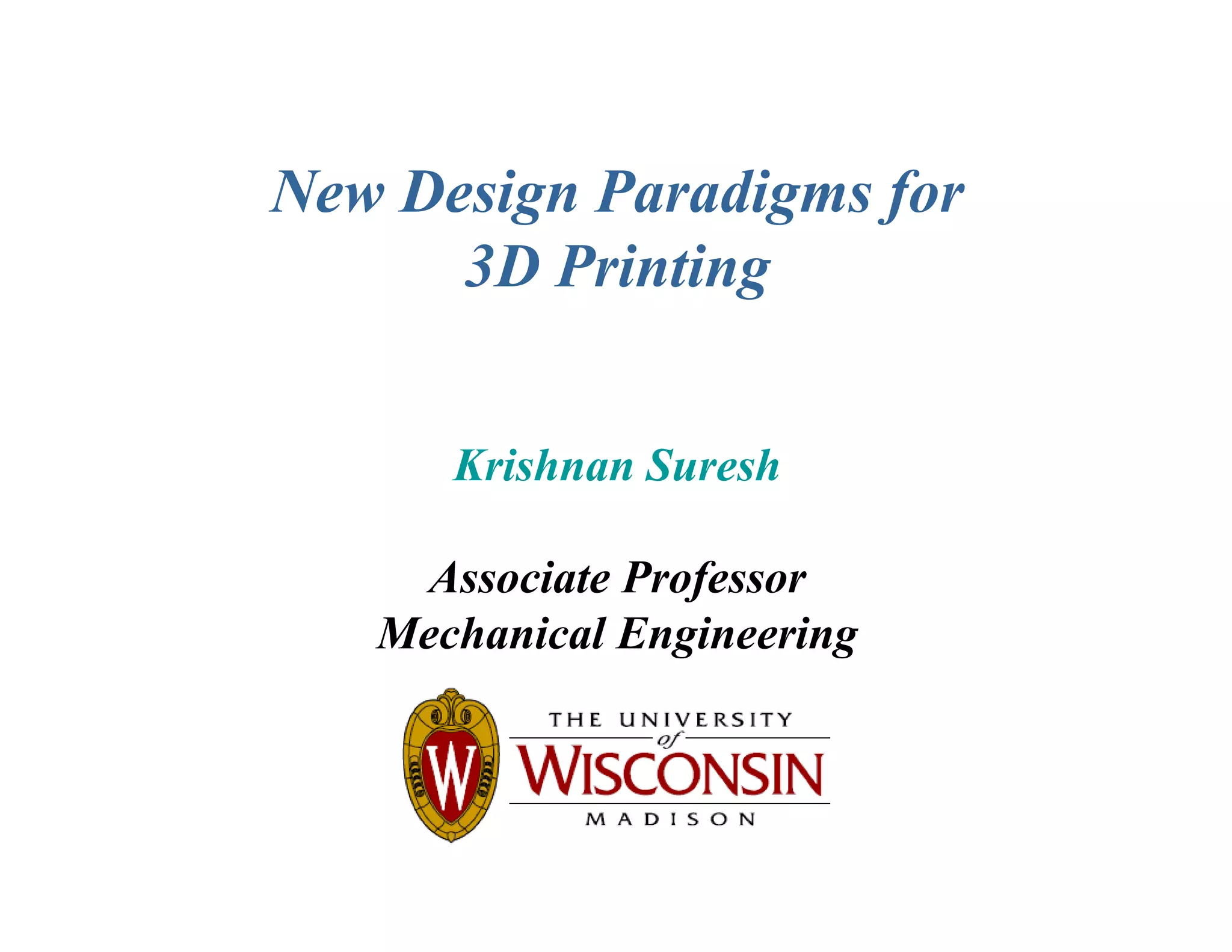 This document discusses new design paradigms enabled by 3D printing. It notes that 3D printing allows for geometric complexity at no added cost, unlike traditional manufacturing. This enables optimal and aesthetically complex part designs that may be stronger yet lighter. However, new design tools are needed to create such optimal complex parts. The document presents topology optimization as one such new tool that can design parts with minimum weight subject to stress constraints. It also discusses how GPU-based simulation can enable real-time topology optimization designs for 3D printing. In conclusion, 3D printing coupled with new design and simulation tools will lead to greater design freedom and more optimal lightweight complex parts.