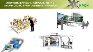 Документ представляет собой информацию о использовании 3D и VR технологий в обучении персонала. Описание включает преимущества VR в управлении и обучении, а также примеры проектов, реализованных Центром виртуальной реальности Крок. Заключительная часть содержит контактные данные Александра Леуса, директора центра.