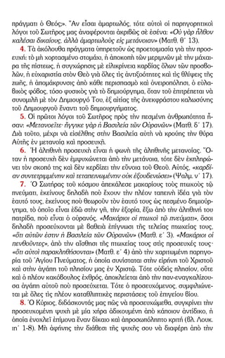 καὶ ἐμπαθῶν παρορμήσεων καὶ κινημάτων· ἐπίσης εἶναι ἡ ἀγά- πη γιὰ τὸν πλησίον, ἡ ὁποία ἀγάπη δὲν διακρίνει μεταξὺ καλοῦ καὶ κα- κοῦ, ἀξίου καὶ ἀναξίου, ἀλλὰ δέεται καὶ προσεύχεται στὸν Θεὸ γιὰ ὅλους, ὅπως γιὰ τὸν ἑαυτό της, σὰν νὰ ἦσαν μέλη της. ᾿Απὸ μία τέτοια ἀγάπη γιὰ τὸν πλησίον, γεννᾶται ἡ καθαρότερη ἀγάπη γιὰ τὸν Θεό. 31. Αὐτοὶ οἱ καρποὶ εἶναι δῶρο Θεοῦ. ῾Ελκύονται στὴν ψυχὴ ἀπὸ τὴν προσοχὴ καὶ τὴν ταπείνωσί της· διατηροῦνται δὲ μὲ τὴν πιστότητα αὐτῆς στὸν Θεό. 32. Μία ψυχὴ ἐπιδεικνύει τὴν πιστότητά της στὸν Θεό, ὅταν ἀπορρί- πτη κάθε ἁμαρτωλὸ λόγο, πρᾶξι καὶ σκέψι καὶ ὅταν μετανοῆ ἀμέσως γιὰ τὶς ἁμαρτίες ἐκεῖνες, στὶς ὁποῖες παρασύρθηκε ἀπὸ τὴν ἀδυναμία της. 33. ᾿Αποδεικνύουμε ὅτι πράγματι ἐπιθυμοῦμε τὸ δῶρο τῆς προσευ- χῆς, μὲ τὴν ὑπομονετικὴ παραμονή μας ἐν προσευχῇ στὶς θύρες τῆς προσ- ευχῆς. Γιὰ τὴν ὑπομονὴ καὶ ἐπιμονή μας δεχόμεθα τὸ δῶρο τῆς προσευ- χῆς. «῾Ο Κύριος», λέγει ἡ Γραφή, δίδει «εὐχήν», δηλαδὴ κεχαριτωμένην, «τῷ εὐχομένῳ» ὑπομονετικὰ καὶ συνεισφέροντι ἁπλᾶ τὴν ἰδική του προσ- πάθεια. 34. Γιὰ τοὺς ἀρχαρίους εἶναι περισσότερο ὠφέλιμες σύντομες καὶ συχνὲς προσευχές, παρὰ μακρὲς προσευχές, οἱ ὁποῖες ἀπέχουν μεταξύ τους χρονικὰ πολύ20 . 35. ῾Η προσευχὴ εἶναι ἡ ὑψηλοτέρα ἄσκησις τοῦ νοῦ. 36. ῾Η προσευχὴ εἶναι ἡ κεφαλή, ἀρχηγός, πηγὴ καὶ μητέρα ὅλων τῶν ἀρετῶν21 . 37. Νὰ εἶσαι σοφὸς στὴν προσευχή σου. Μὴ ζητῆς σὲ αὐτὴν ὁ,τιδήπο- τε φθαρτὸ ἢ μάταιο, ἐνθυμούμενος τὴν ἐντολὴ τοῦ Σωτῆρος: «Ζητεῖτε πρῶτον τὴν Βασιλείαν τοῦ Θεοῦ καὶ τὴν Δικαιοσύνην Αὐτοῦ καὶ ταῦτα πάντα», δηλαδὴ ὅλα ὅσα χρειάζεσθε γιὰ τὴν ἐφήμερη ζωή σας, «προστε- θήσεται ὑμῖν» (Ματθ. στ´ 33)22 . 38. ῞Οταν σκοπεύης νὰ πράξης ὁ,τιδήποτε ἤ ἐπιθυμῆς κάτι, ἐπίσης δὲ ὅταν εἶσαι σὲ δύσκολες περιστάσεις, πρόσφερε τὴν σκέψι σου μὲ προ- σευχὴ στὸν Θεὸ –ζήτησε αὐτὸ ποὺ θεωρεῖς ὅτι χρειάζεσαι καὶ ποὺ θὰ σὲ ὠφελήση. ῞Ομως, ἄφησε τὴν ἐκπλήρωσι ἢ μὴ ἐκπλήρωσι τοῦ αἰτήματός σου στὸ θέλημα τοῦ Θεοῦ, μὲ πίστι καὶ ἐλπίδα στὴν παντοδύναμη σοφία καὶ τὴν καλωσύνη τοῦ θελήματός Του. Αὐτὸν τὸν ἐξαίρετο τρόπο προ- σευχῆς μᾶς ἔδωσε ᾿Εκεῖνος, ὁ ῾Οποῖος προσευχήθηκε στὸν κῆπο τῆς Γεθσημανῆ οὕτως, ὥστε τὸ ποτήριο ποὺ εἶχε καθορισθῆ γι᾿ Αὐτὸν νὰ
