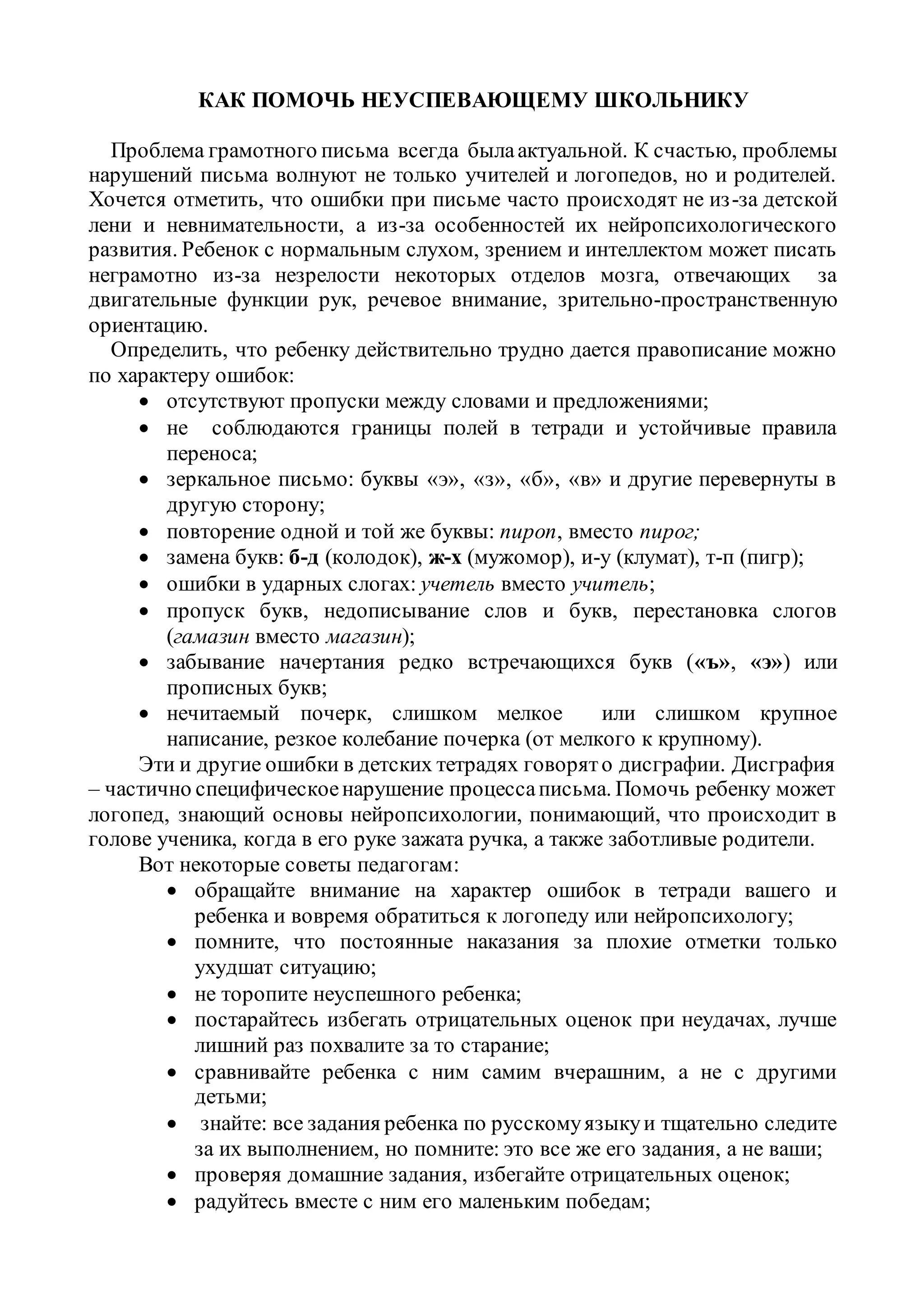 Документ обсуждает проблему грамотного письма у школьников, отмечая, что ошибки могут быть следствием нейропсихологических особенностей, а не лени. В нем приведены различные типы ошибок и даны рекомендации для родителей и педагогов о том, как поддерживать детей, а также как использовать чтение для улучшения письменных навыков. Также представлены упражнения, направленные на коррекцию дисграфии и улучшение письменной речи.