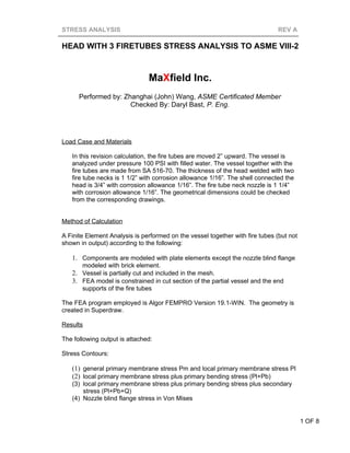 The document summarizes a stress analysis of a vessel head with 3 fire tubes. A finite element analysis was performed to analyze stresses under 100 PSI pressure. The analysis found that local primary membrane stress, general primary membrane stress on the vessel and head, and total stresses including primary membrane, bending, and secondary stresses all met the stress limits defined in the ASME code. The stresses were below the material's ultimate strength of 70 ksi and satisfied the specific stress limits given in ASME VIII-2.