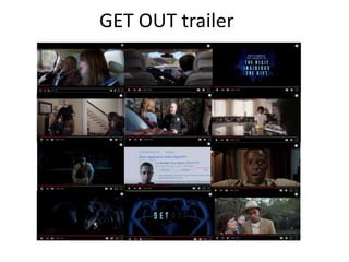 The document summarizes research on trailers and posters for psychological thriller films. It analyzes the overall structures, sounds, and visual elements of trailers for Get Out and We Need to Talk About Kevin. It also analyzes posters for Silence of the Lambs and Black Swan. Key findings include how the trailers use tension-building music and editing to portray the films' psychological elements without revealing full plots. Common visual techniques identified are use of color symbolism and compositional elements to characterize figures and hint at themes. The analysis will inform the creator's own production work through suggestive imagery, sound design, and portrayal of characters' emotions.