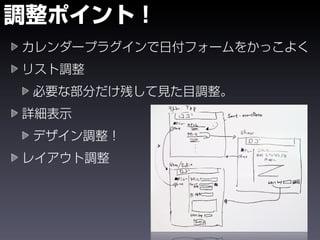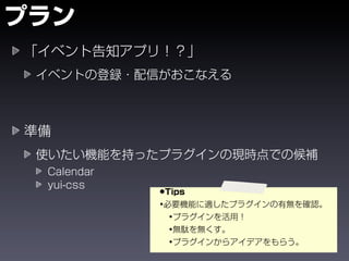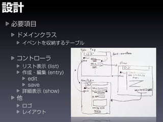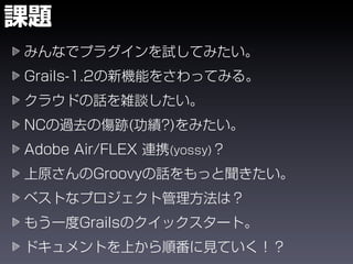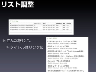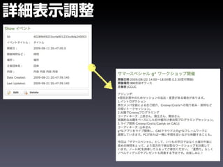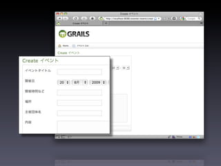 The document shows the steps to create a Grails application called eventer, generate a domain class and controller for an Event entity, and add validation constraints and labels. It also demonstrates installing plugins like calendar and yui-css to add date pickers and CSS styling to the views. The goal is to create a basic event management application in Grails.