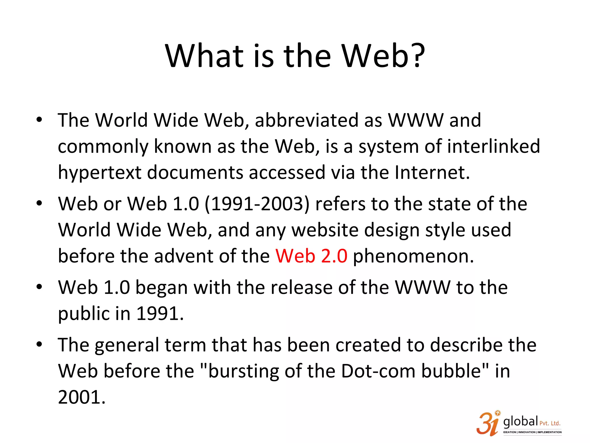 Web 1.0 refers to the early World Wide Web from 1991-2003, which featured static pages that users could only read. Web 2.0 began around 2004 and features dynamic, user-generated content through technologies like blogs, wikis, social media, and more. Web 2.0 aims to be a customizable network to link users to information and each other through an easy to use interface. Basic programming knowledge and tools like HTML, CSS, PHP, MySQL, and JavaScript are required to develop for Web 2.0.