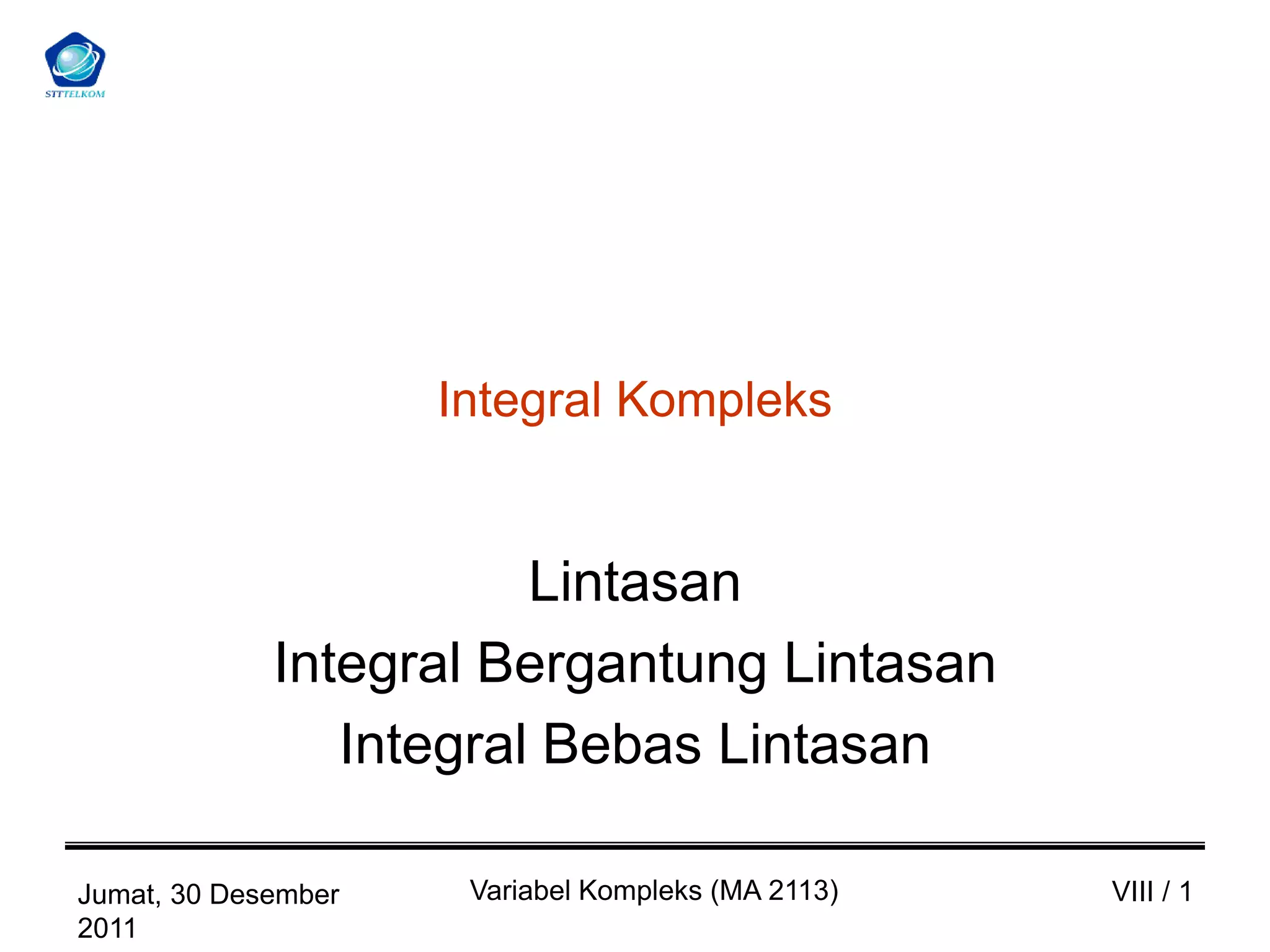 Dokumen ini membahas tentang integral kompleks, termasuk definisi lintasan, turunan, dan integral berdasarkan lintasan, serta jenis lintasan. Diberikan juga contoh-contoh perhitungan integral lintasan untuk fungsi kompleks tertentu. Selain itu, dibahas juga tentang integral bebas lintasan, sifat-sifat integral analitik, dan teorema Cauchy.